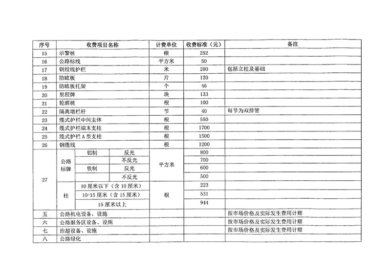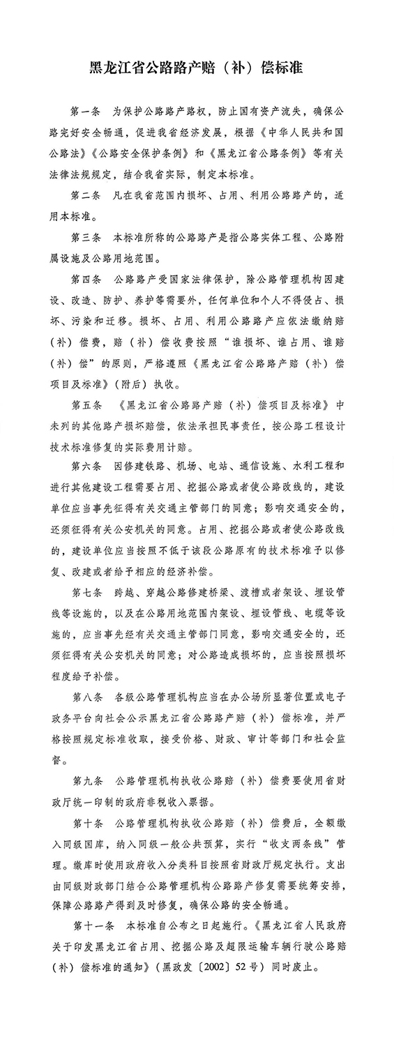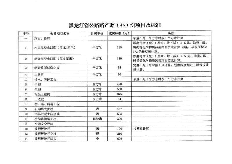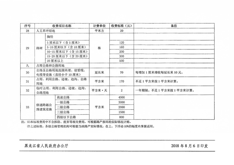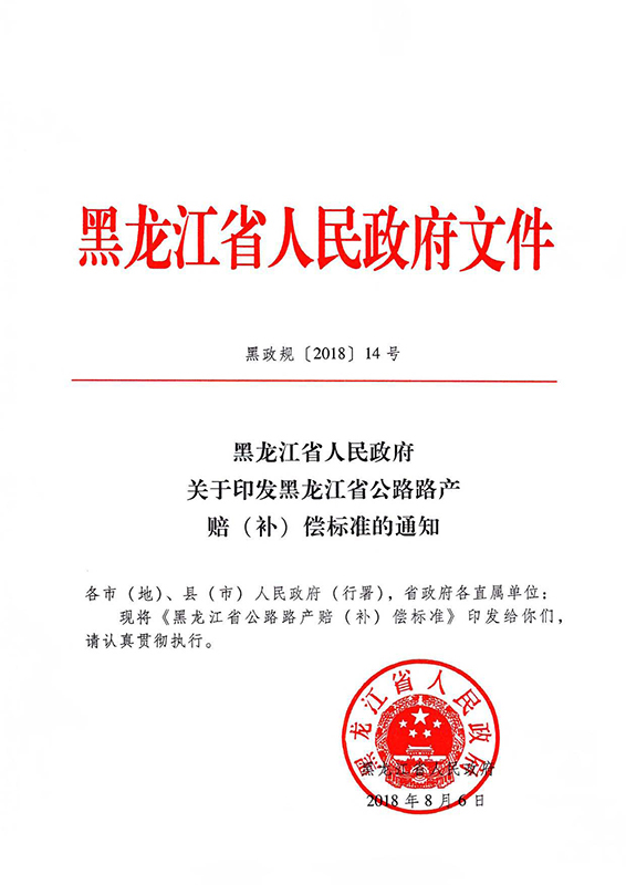 黑龙江省人民政府关于印发黑龙江省公路路产赔(补)偿标准的通知(2018-14号)