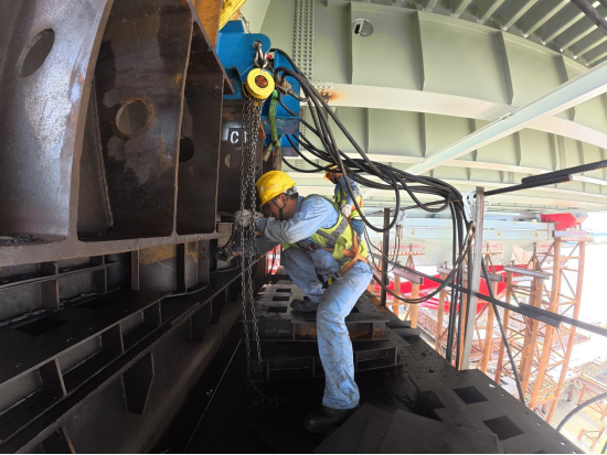 落梁装置采用自主研发的装配式组合落梁钢垫块,通过千斤顶顶升、回落,循环作业不断抽离垫块,使中跨桥面系缓慢下落至设计位置,单次落梁动作最大可下降10公分。