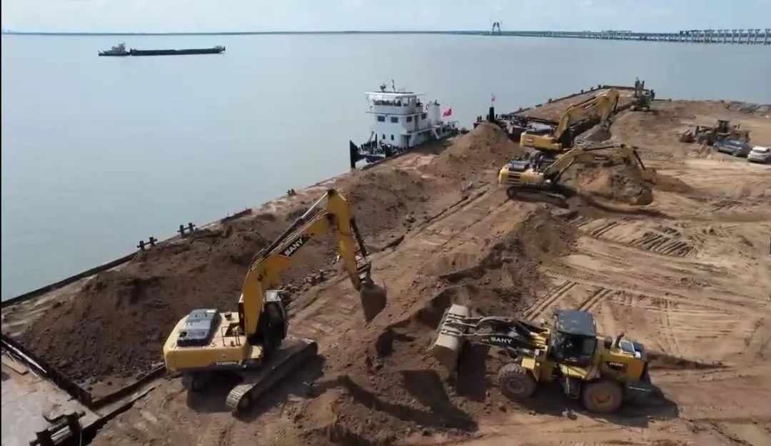 岸上拉运土方的车辆一片繁忙,江上船舶运输也是紧张有序。空船在岸边等待装满土方驶离,装满土方的船只鸣笛缓缓离岸驶向北岸。