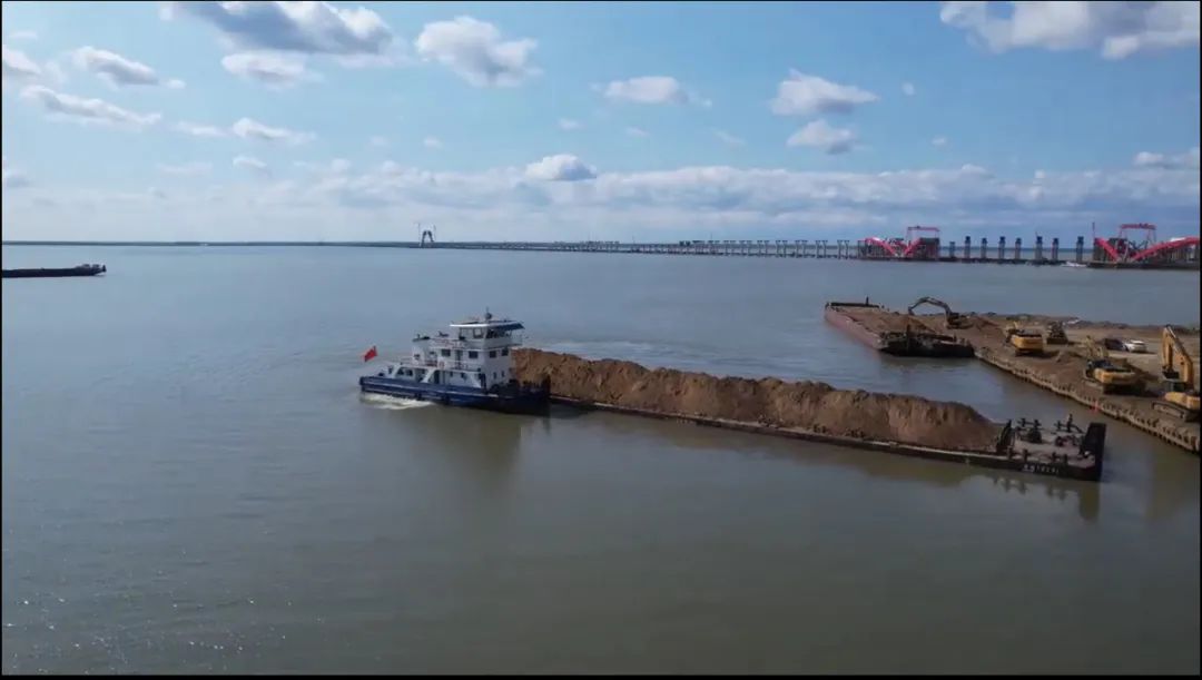 项目经理王奎看着岸上和江上忙碌的施工场景说,这次土方运输环节复杂,涉及安全、协调、运输等多层面,管理工作量大。A-B段运输路线长约120公里,传统路运效率受限。为按时完成施工任务,项目创新采用“冬季栈桥+夏季船舶+路运”运输模式:冬季利用松花江结冰期搭建临时栈桥,缩短运距40%,单日最大运量达2万立方米;夏季以船舶运输为主、路运为辅,协调各部门,持续作业,船舶运输效率提升至40%。