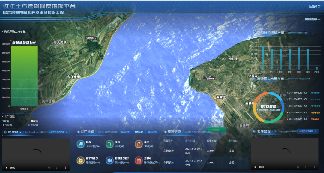 为了保障运输安全,项目部开发了土方运输智慧管理平台,对运输车辆和船只通过北斗定位进行监控,车辆超速、路线偏离、车辆拥堵都会及时报警。利用多台次车间距计算,提醒司机控制车辆间距,实时掌握车辆运输动态等。在监控平台上,监控人员可实时监控施工现场运输车辆、江上运输船只的情况,一旦发现问题会及时处理。