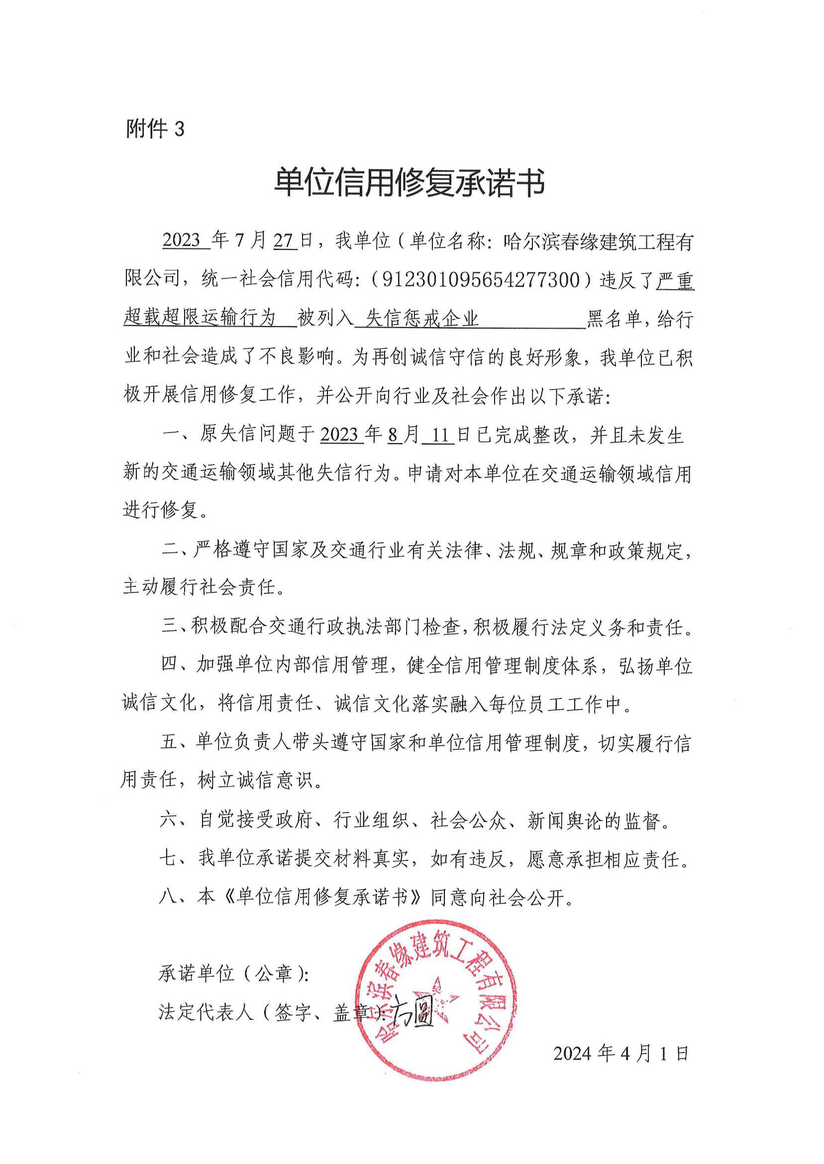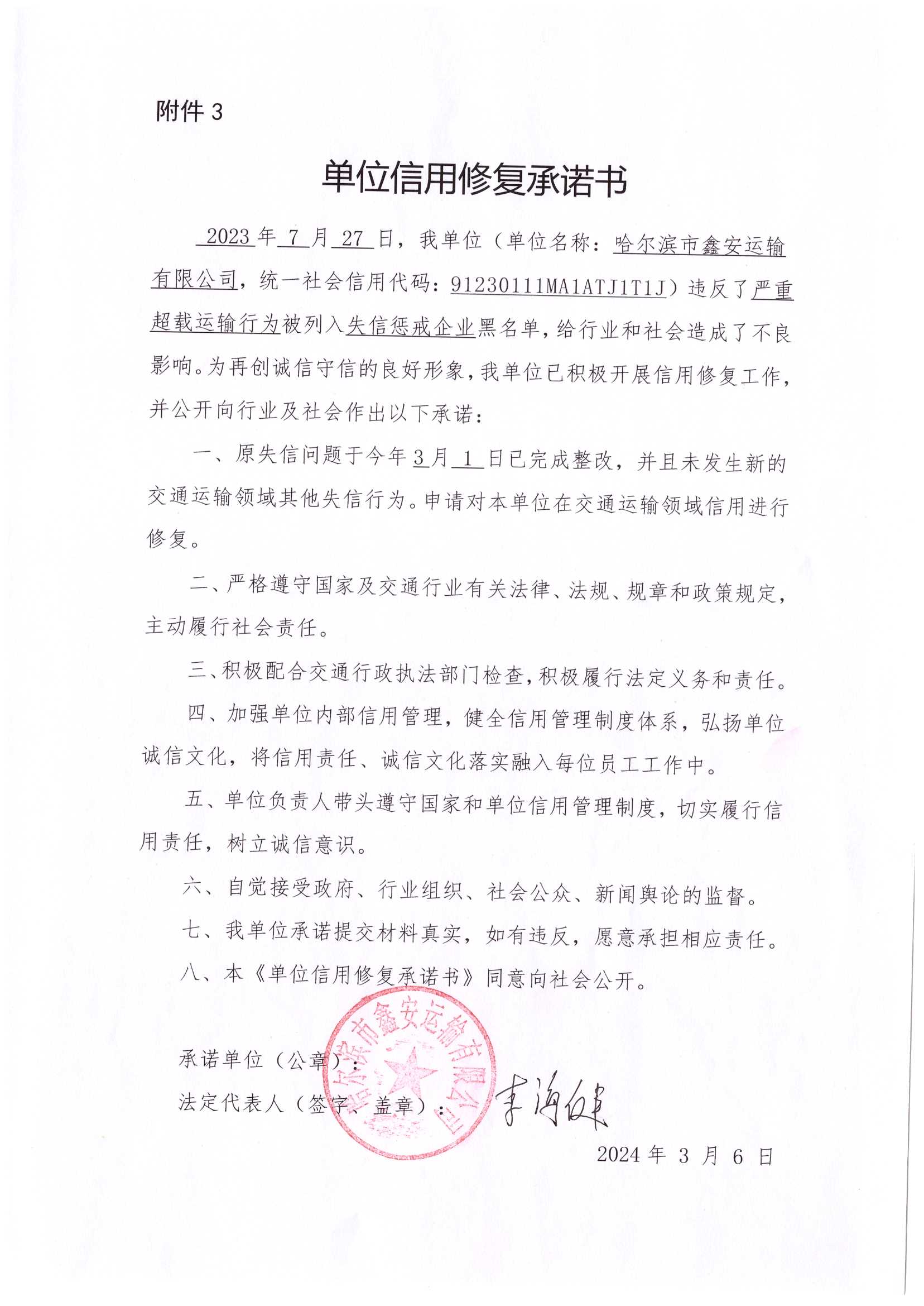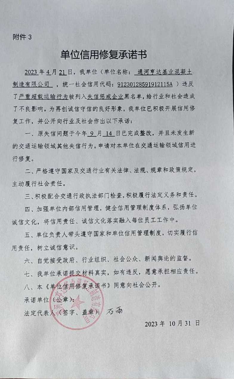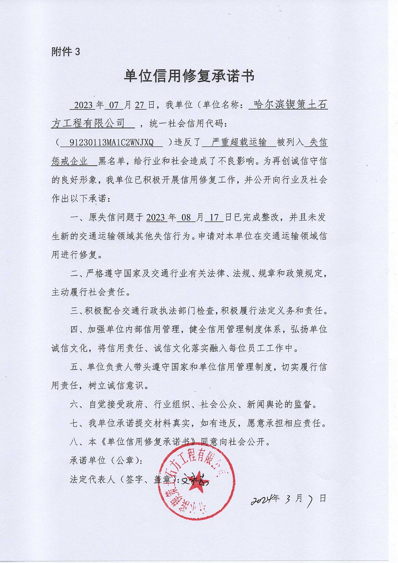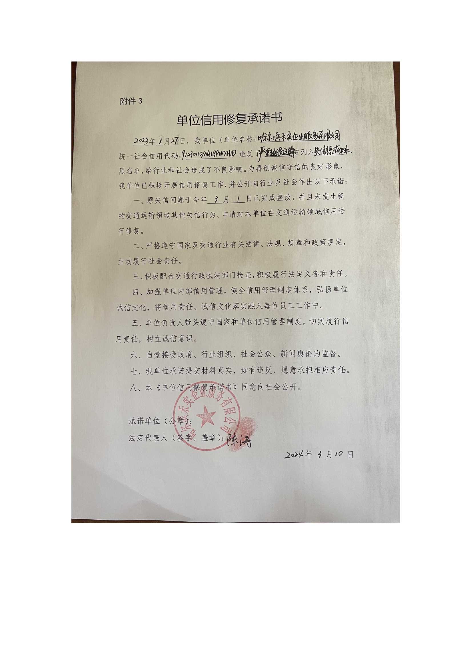 信用修复承诺书