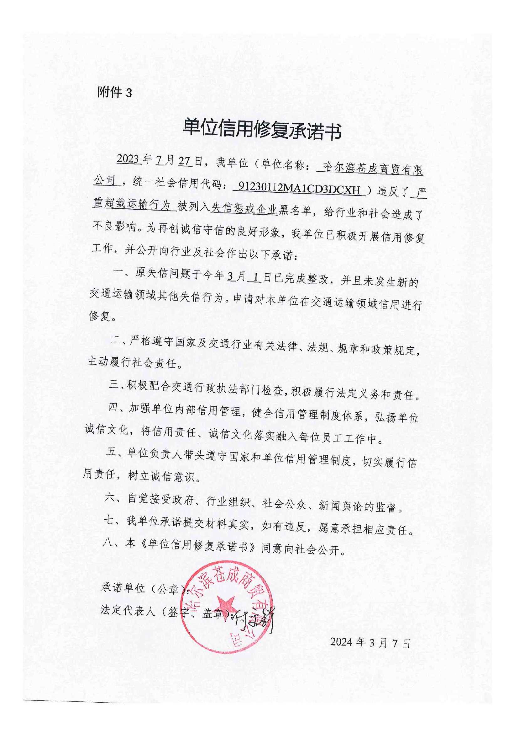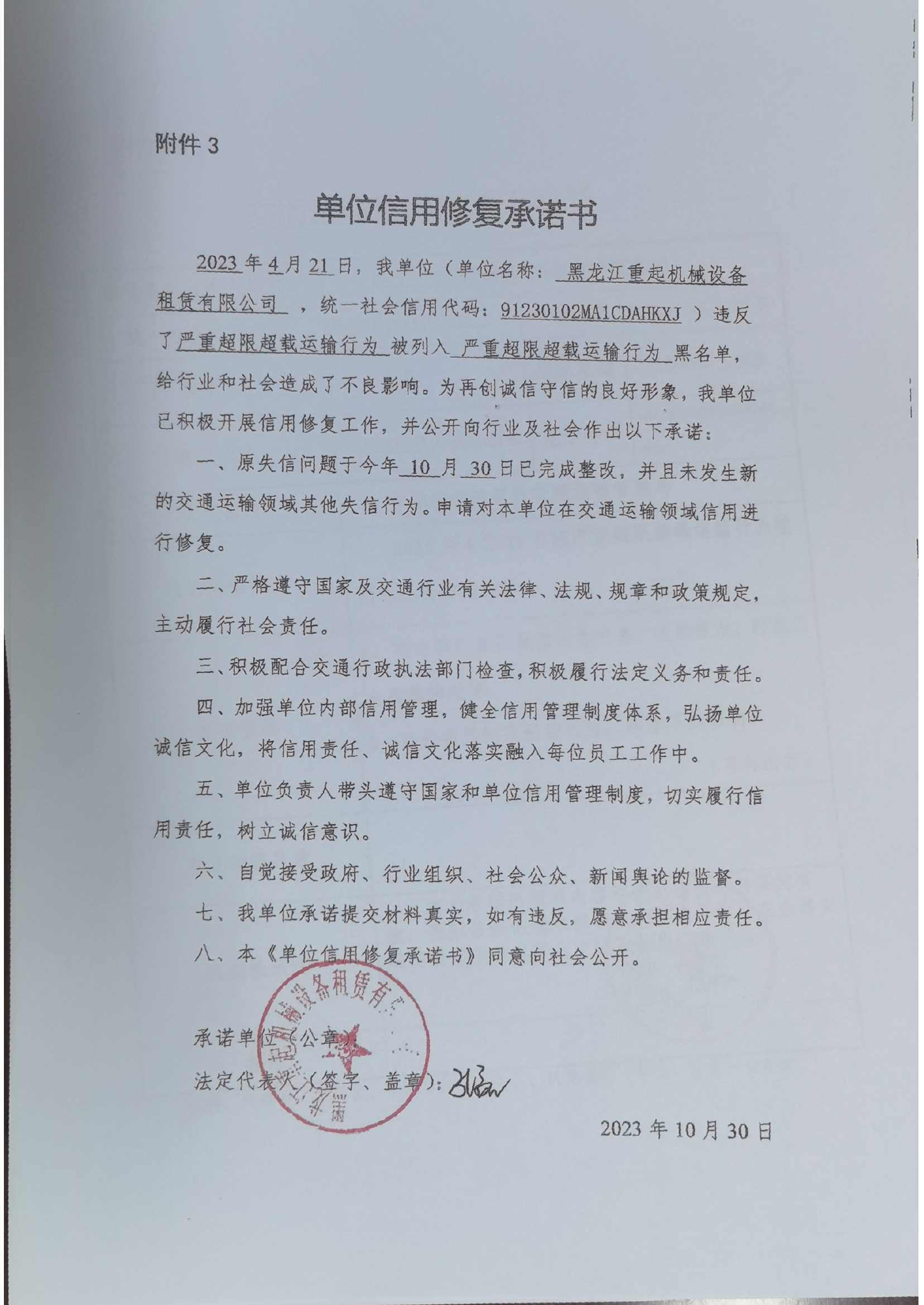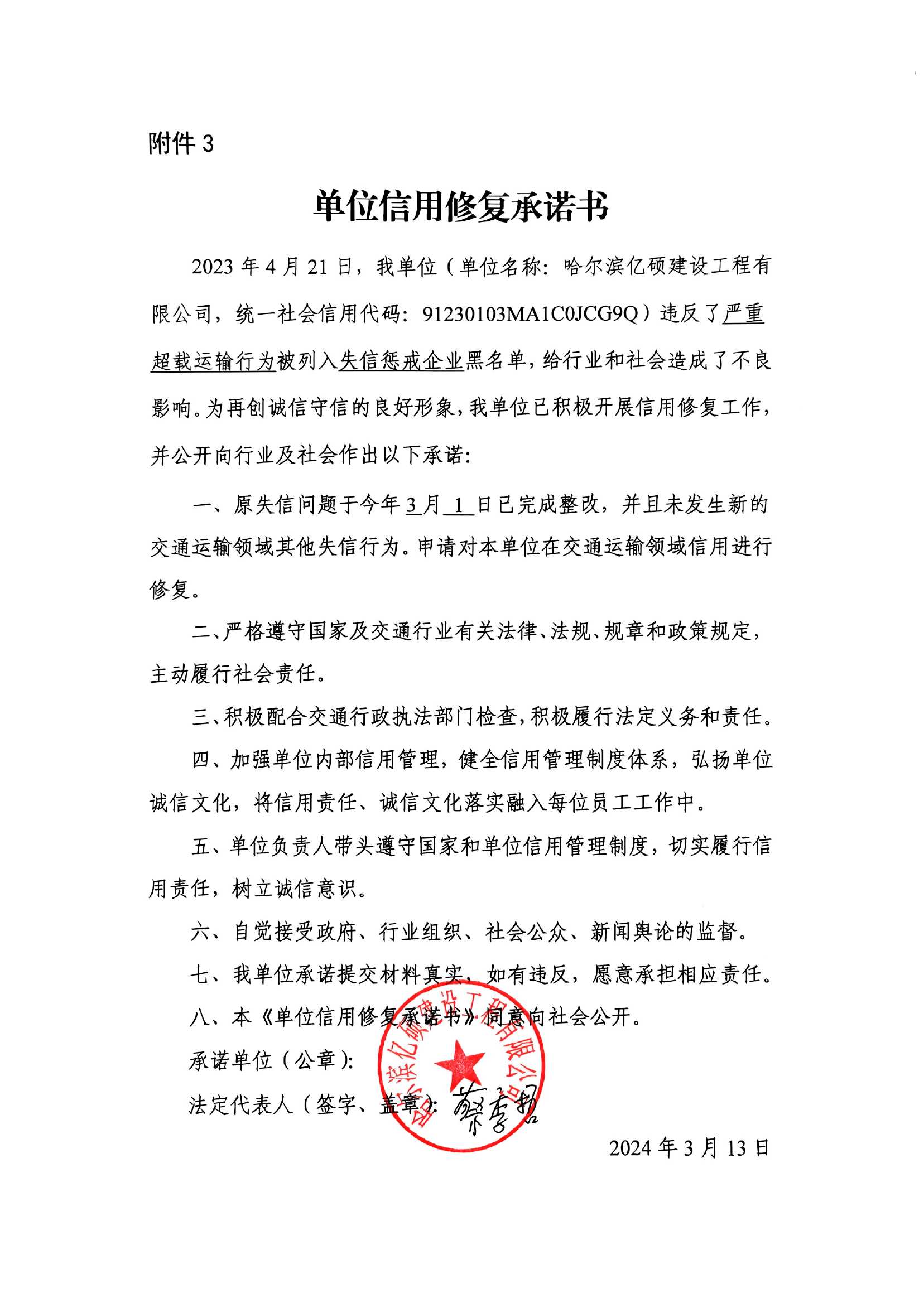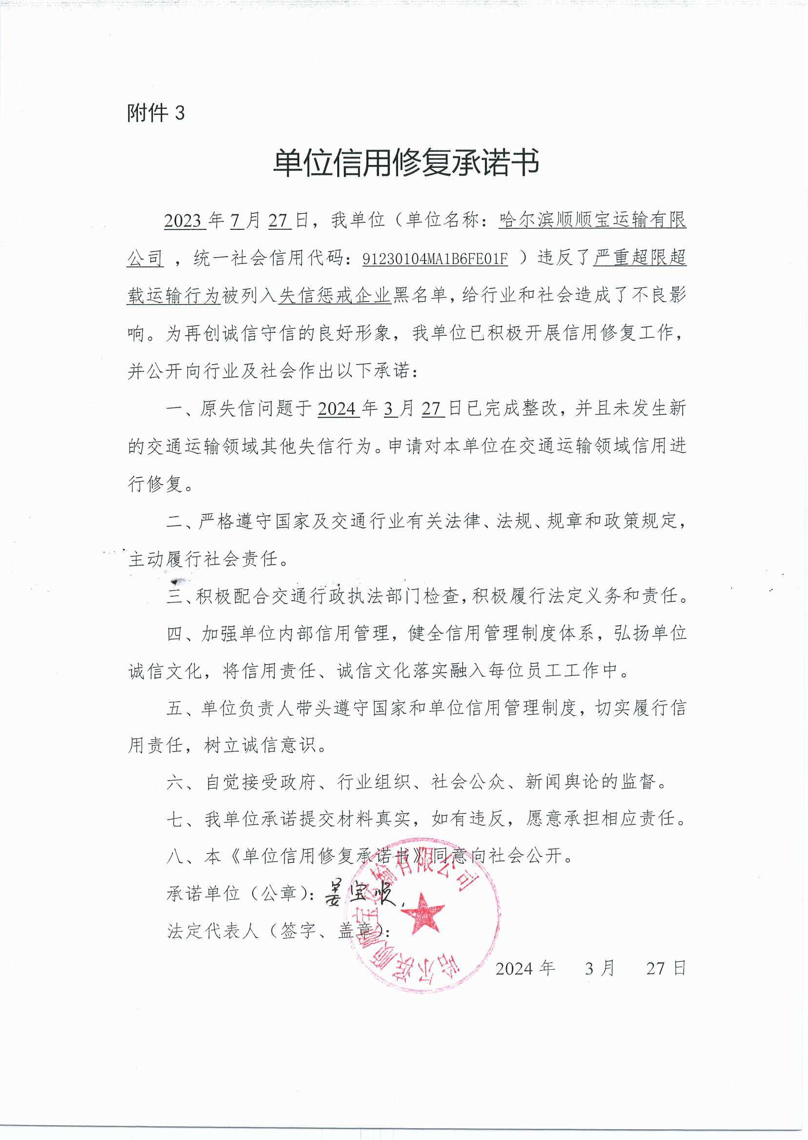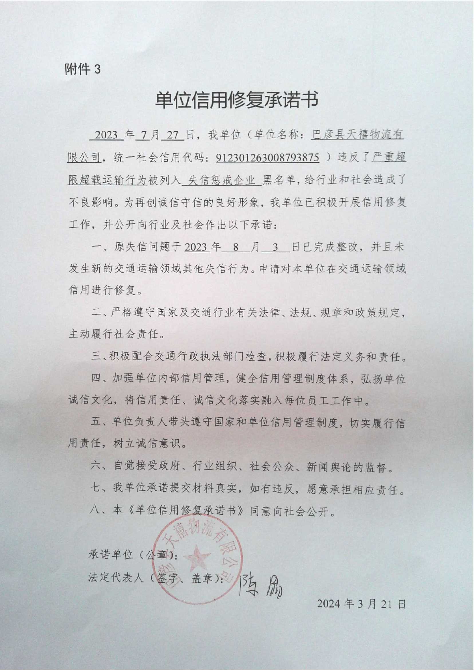 信用修复承诺书