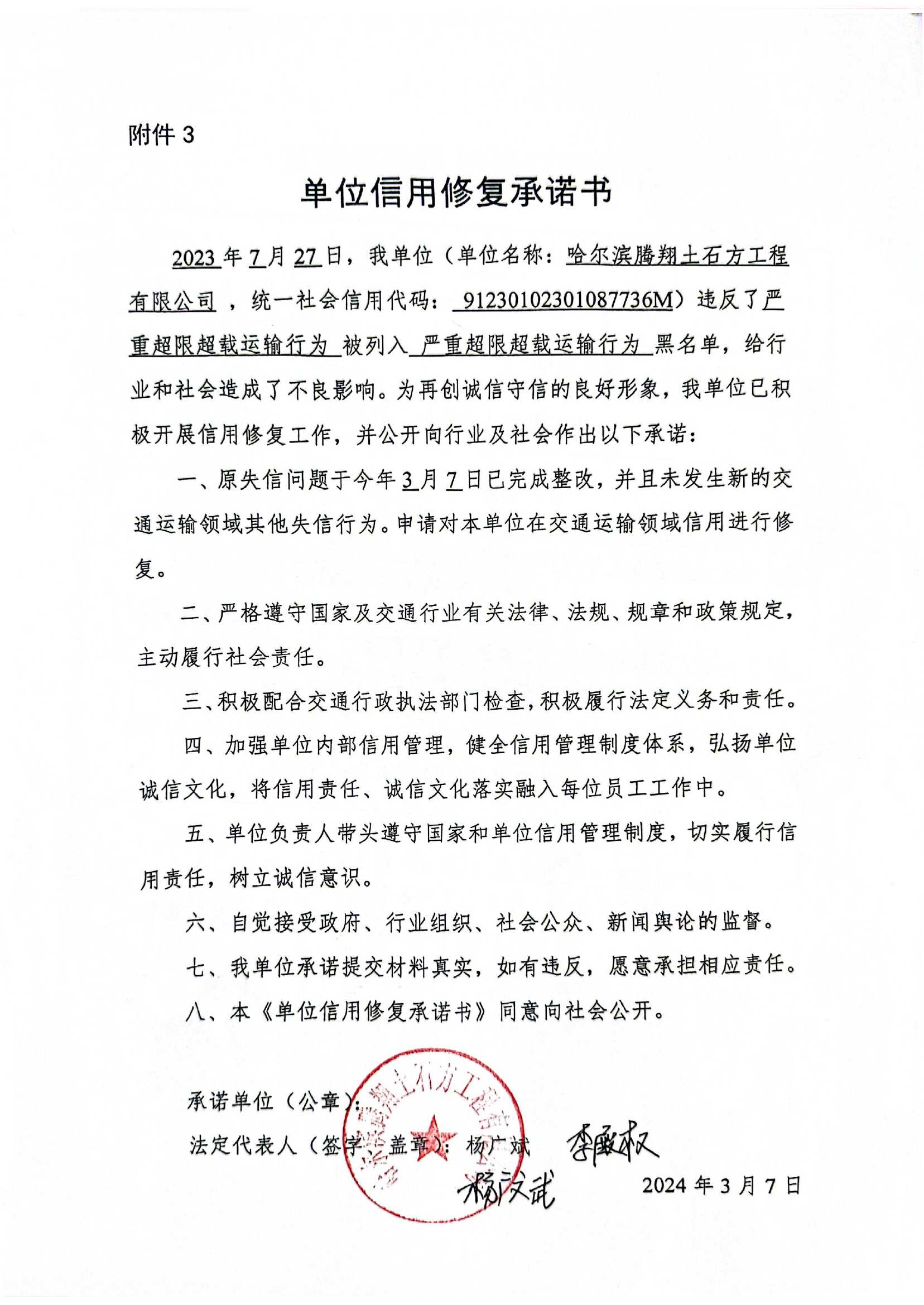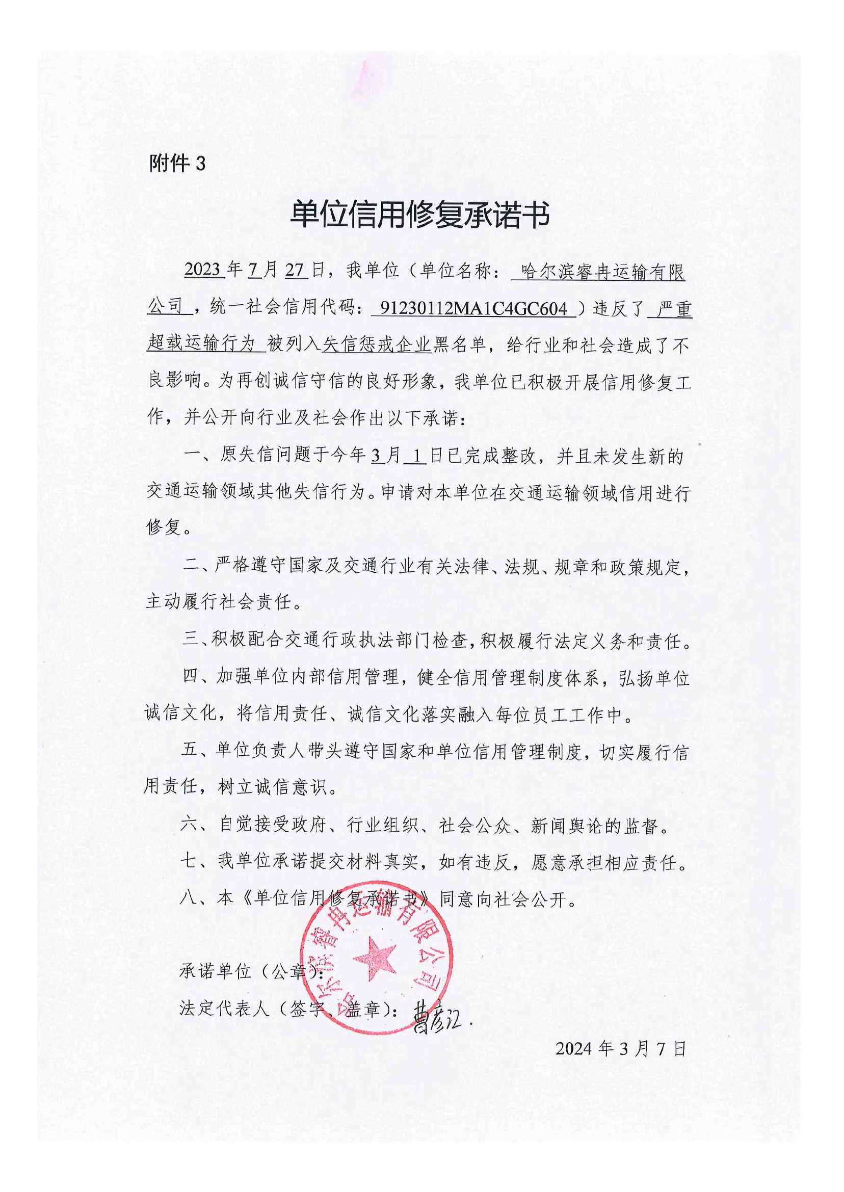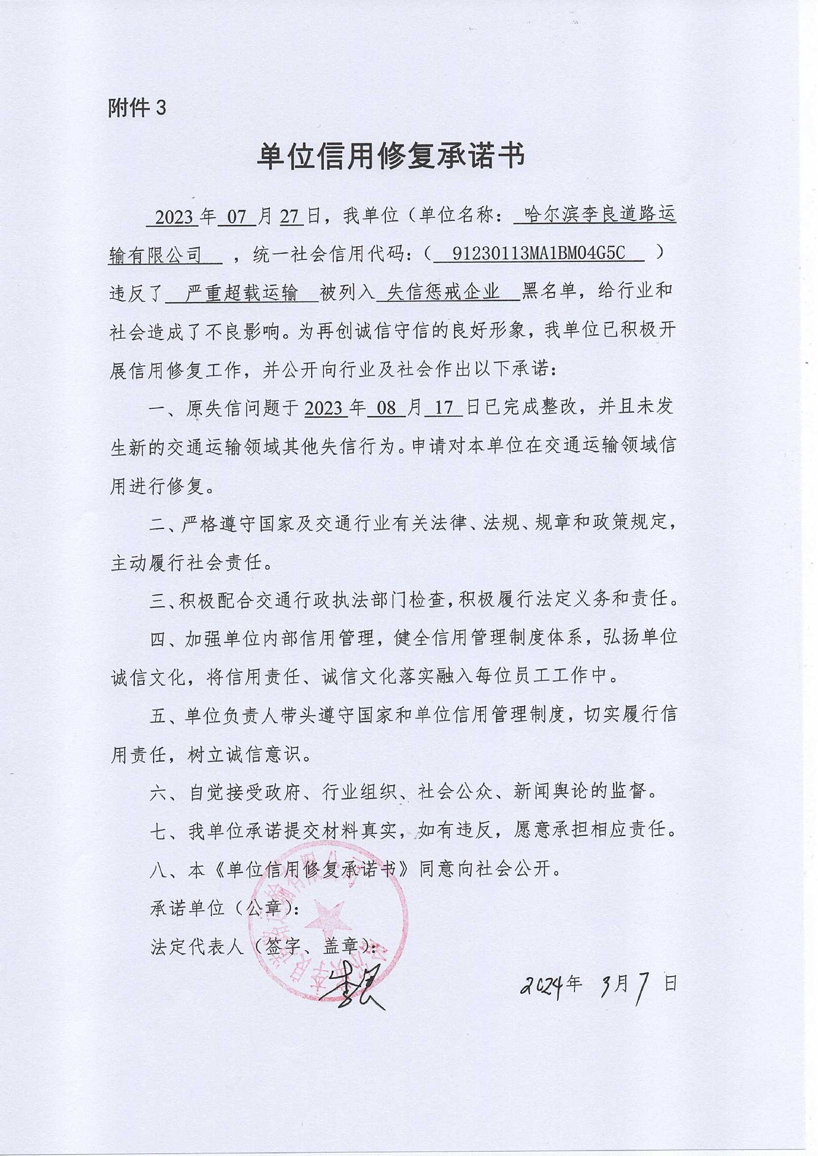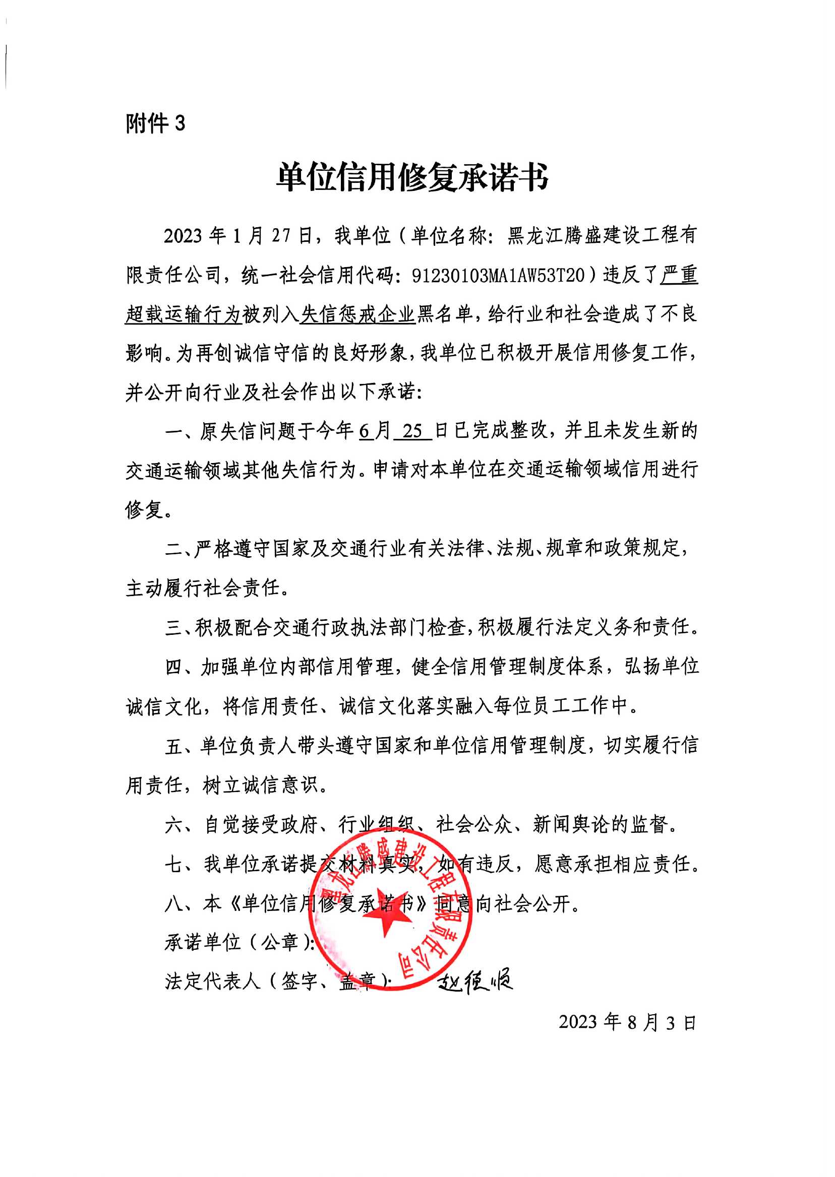 信用修复承诺书