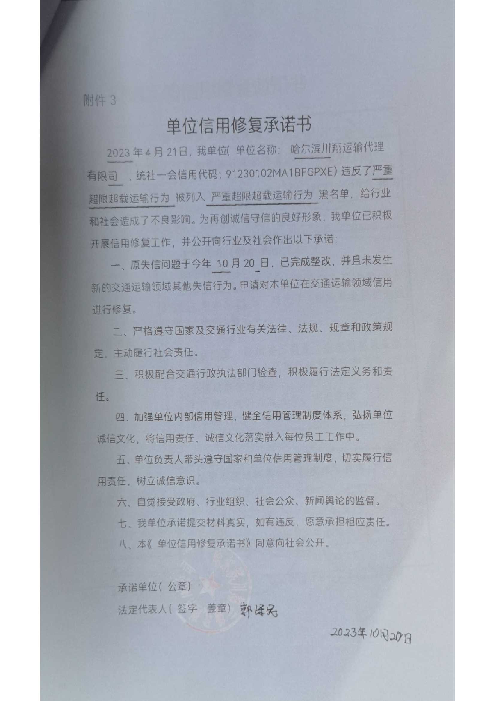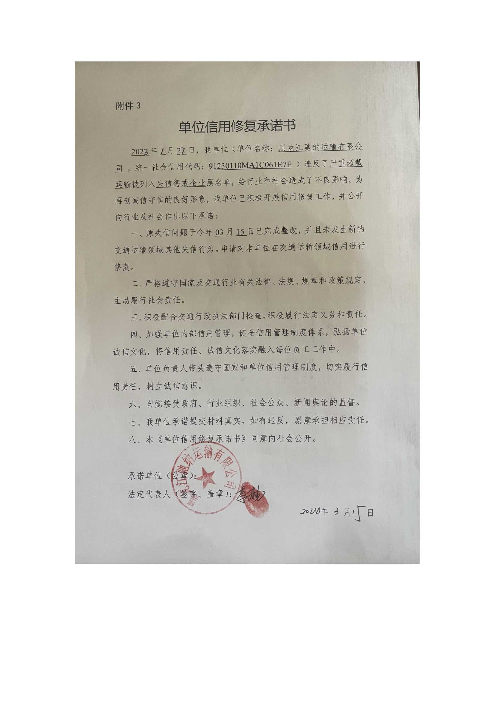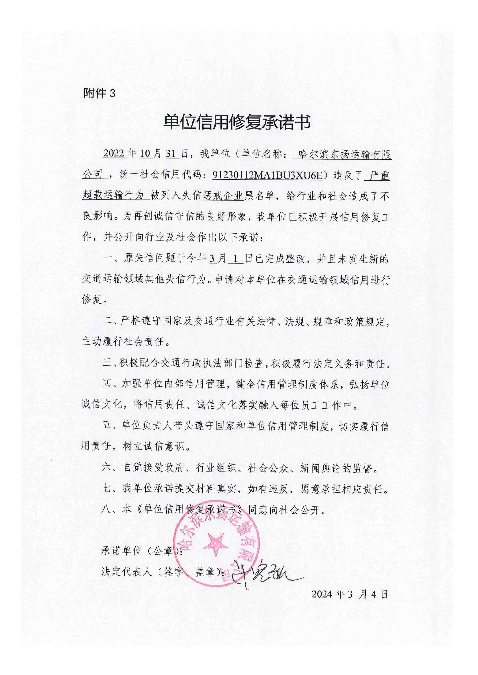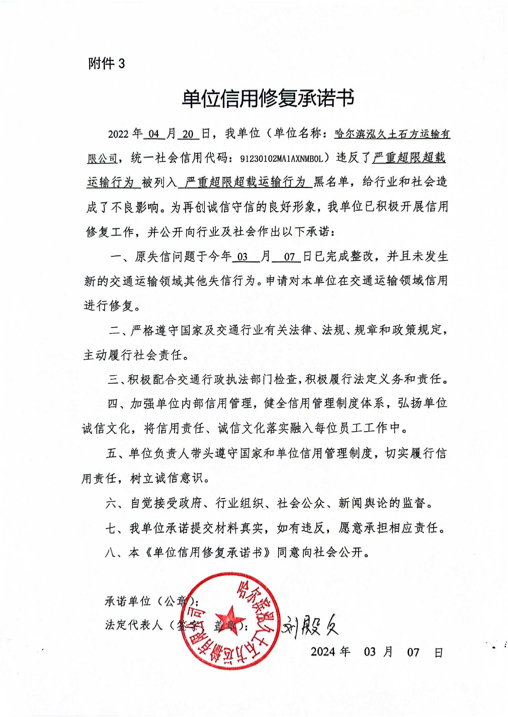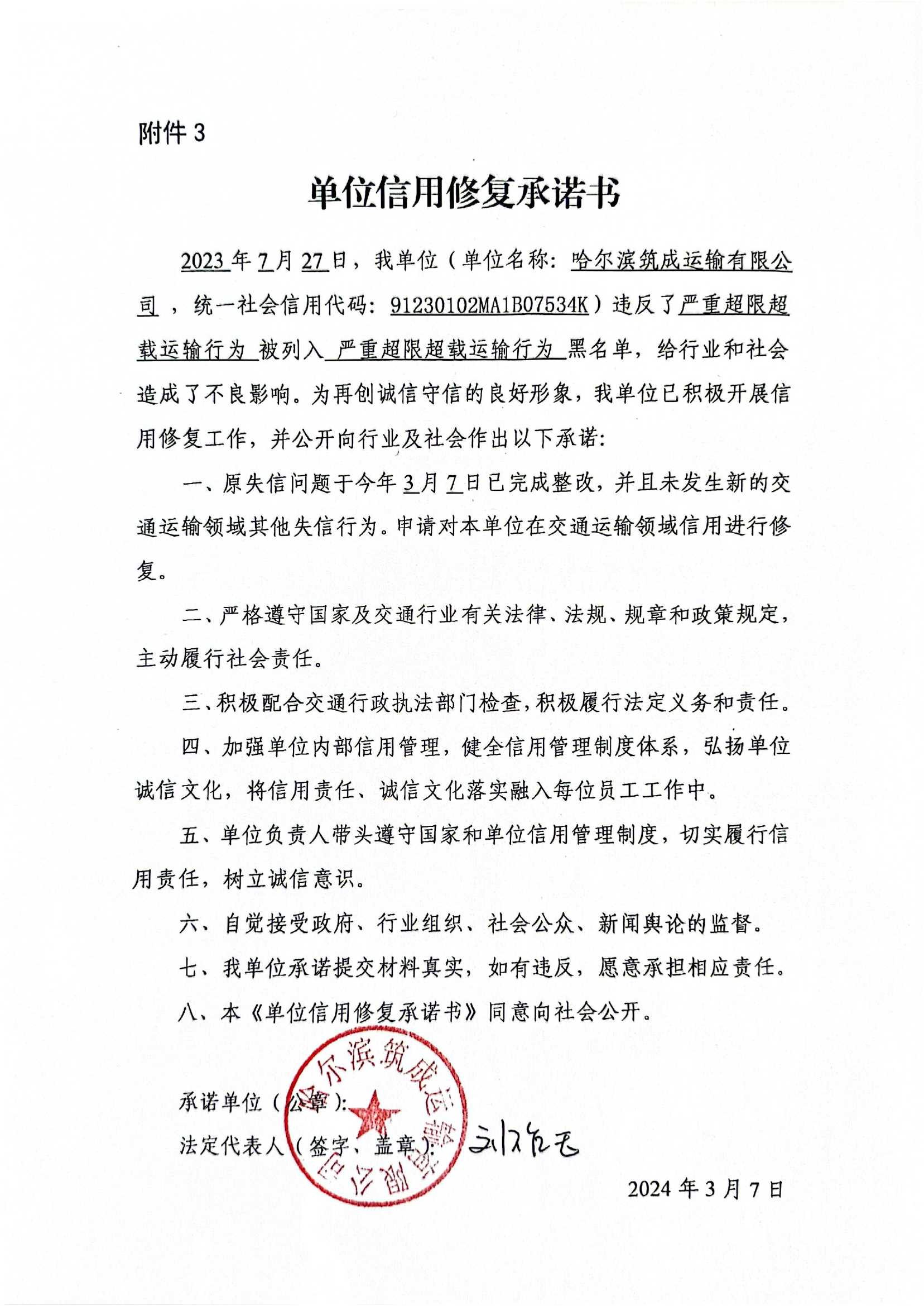 信用修复承诺书