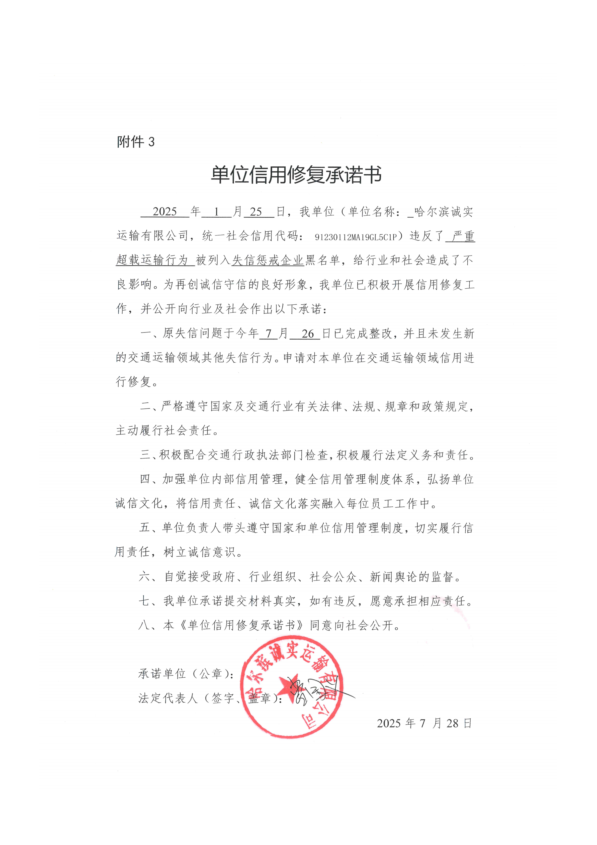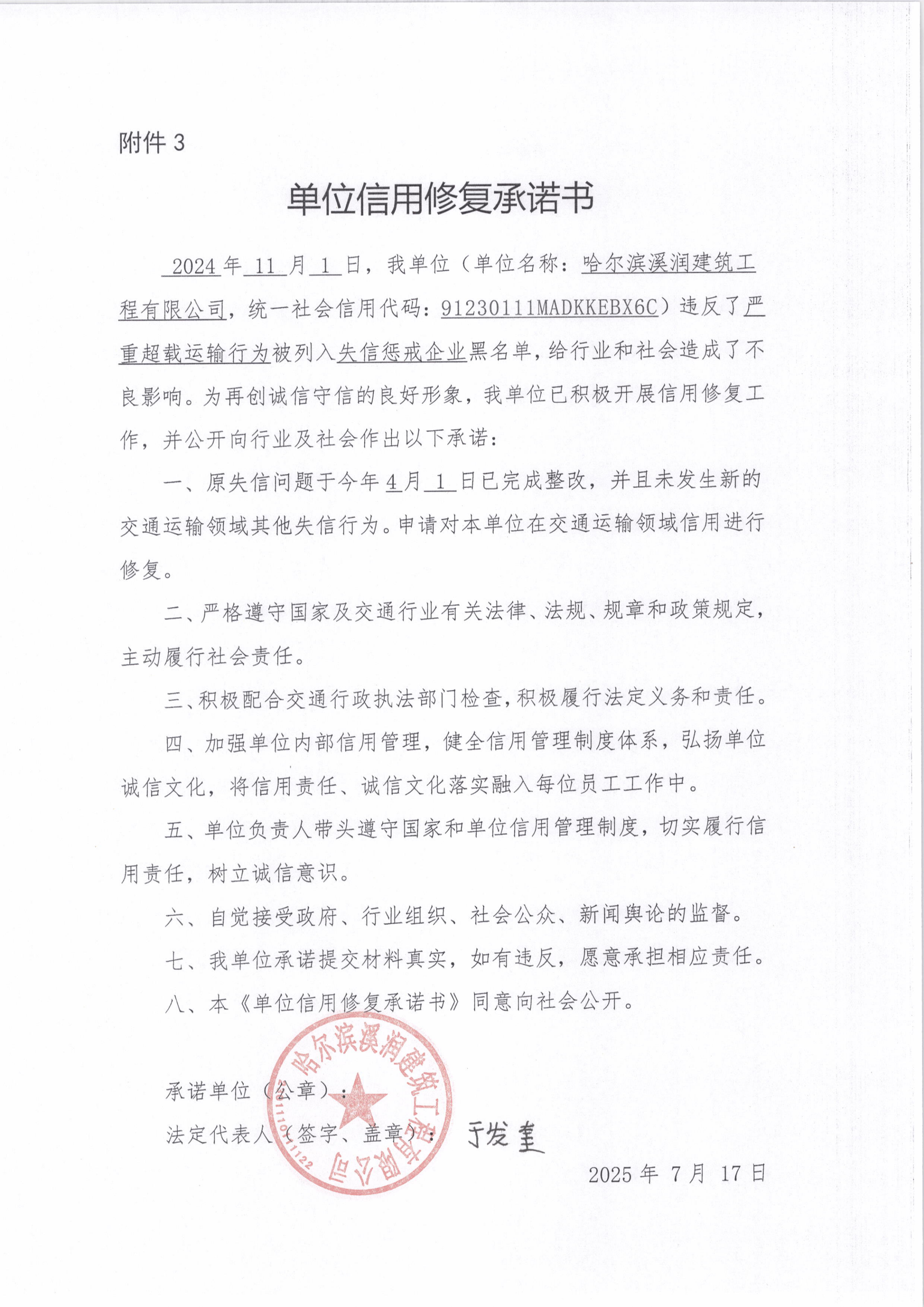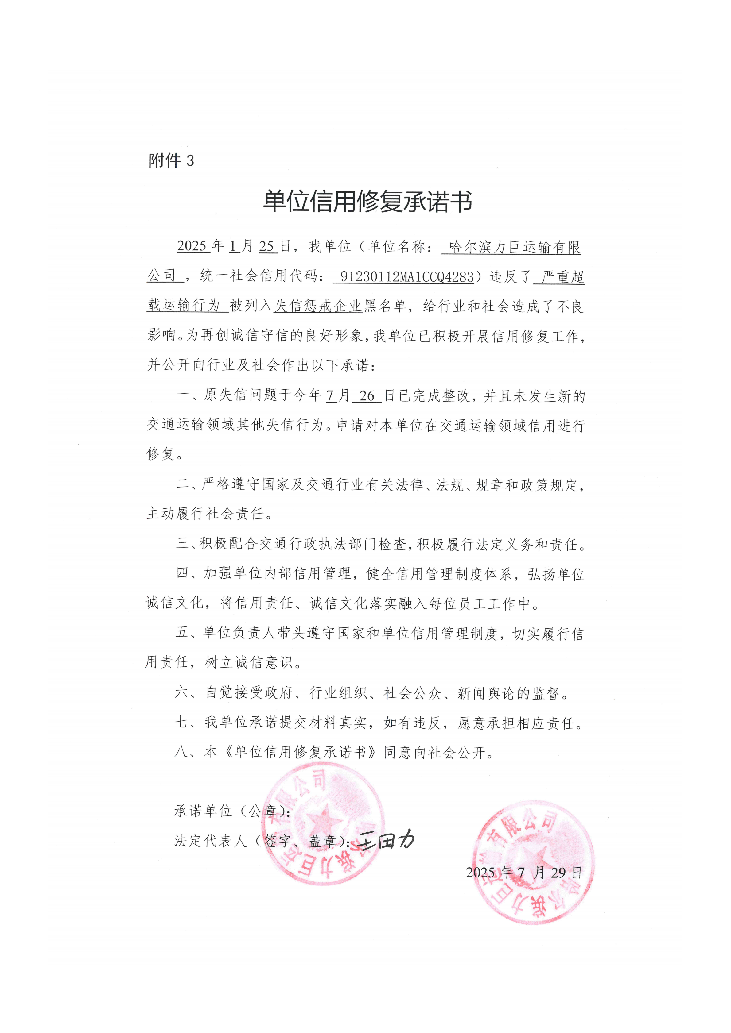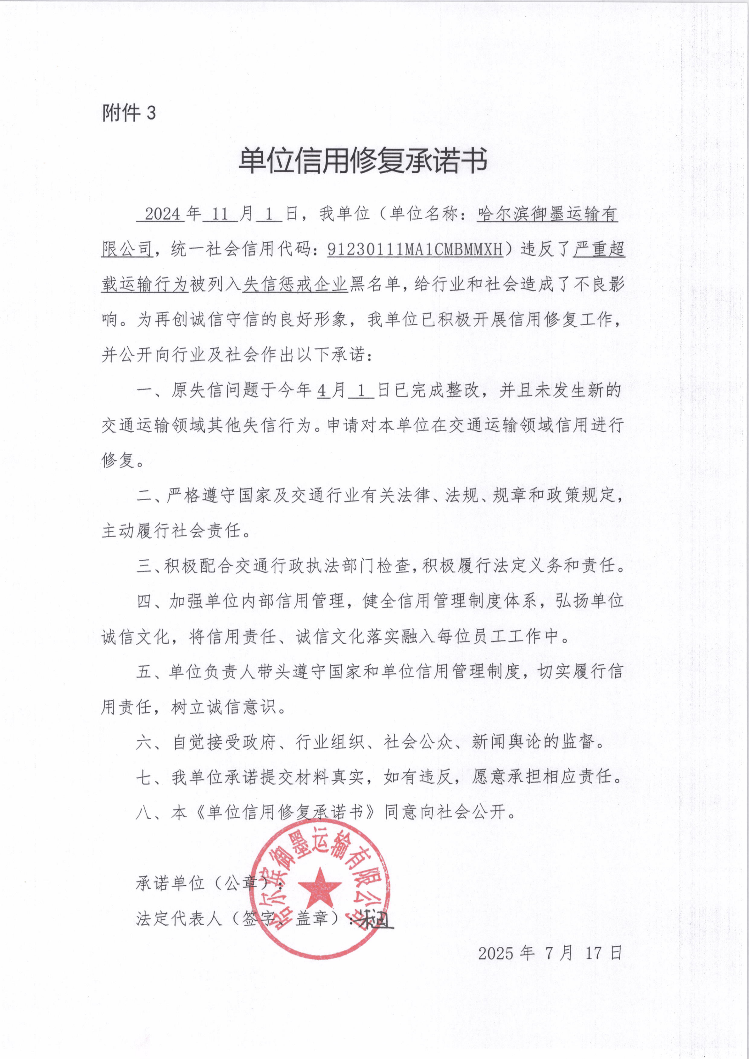 信用修复承诺书