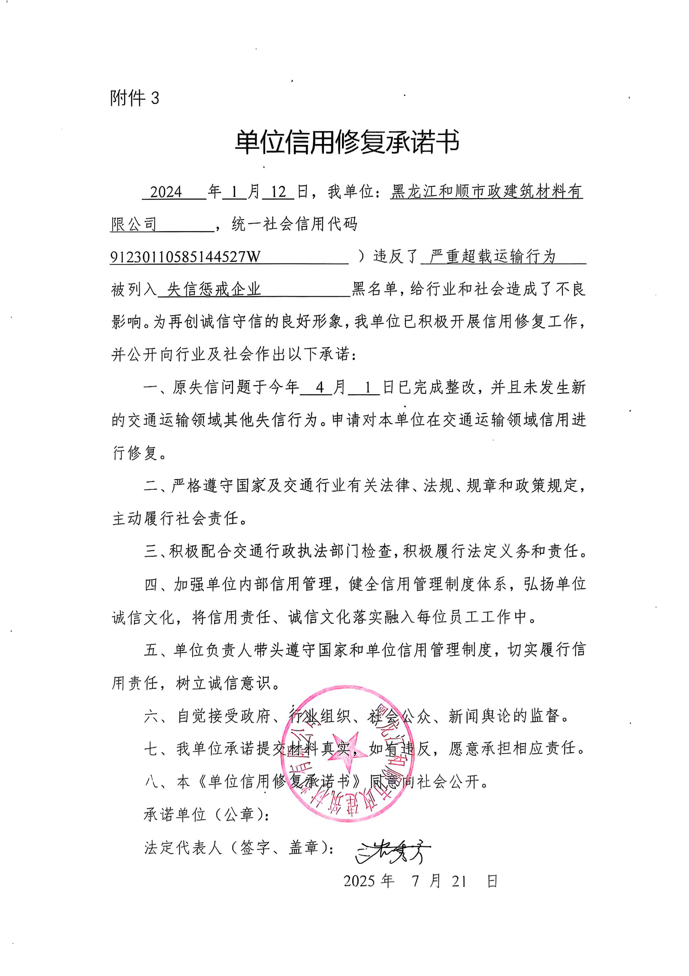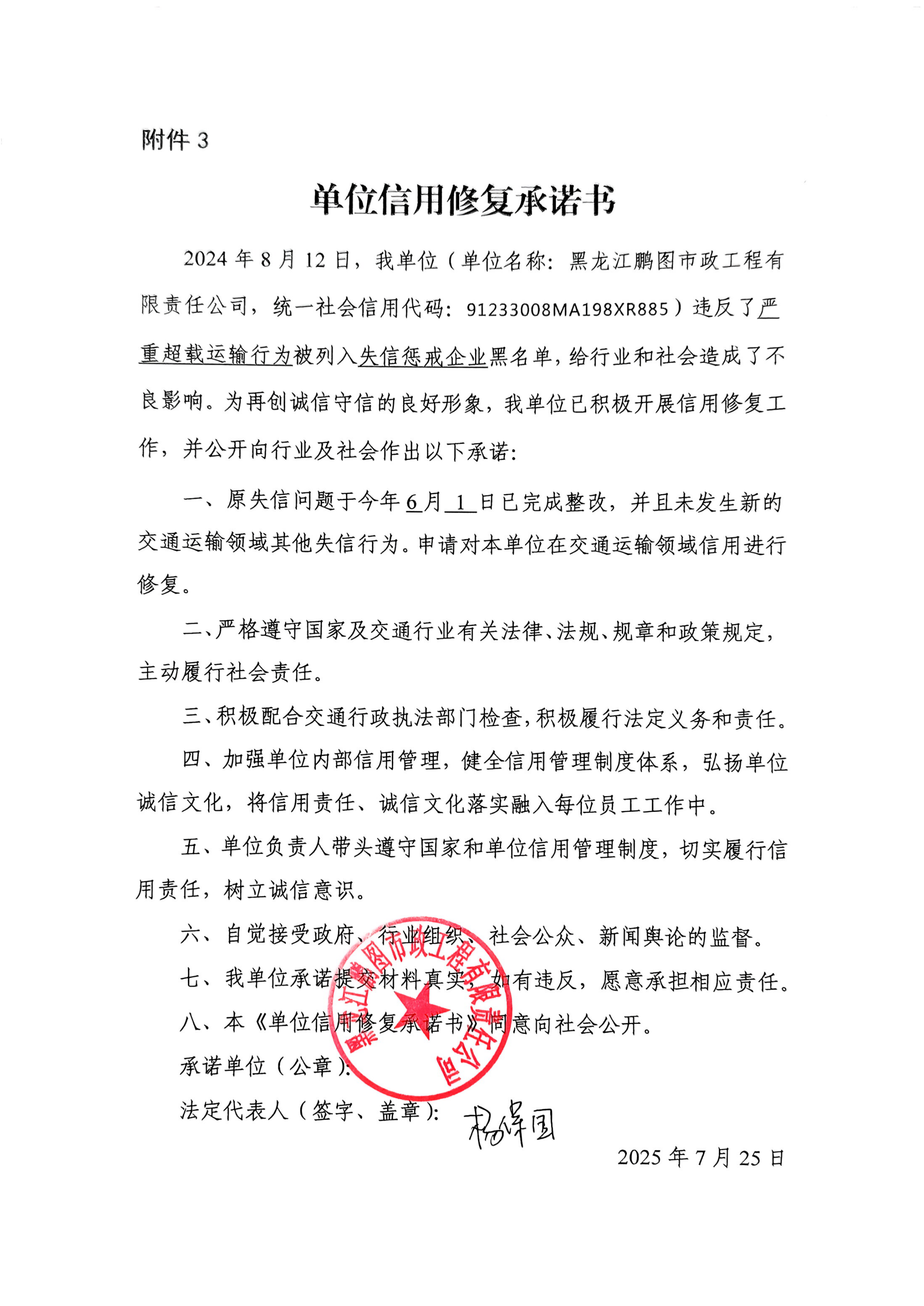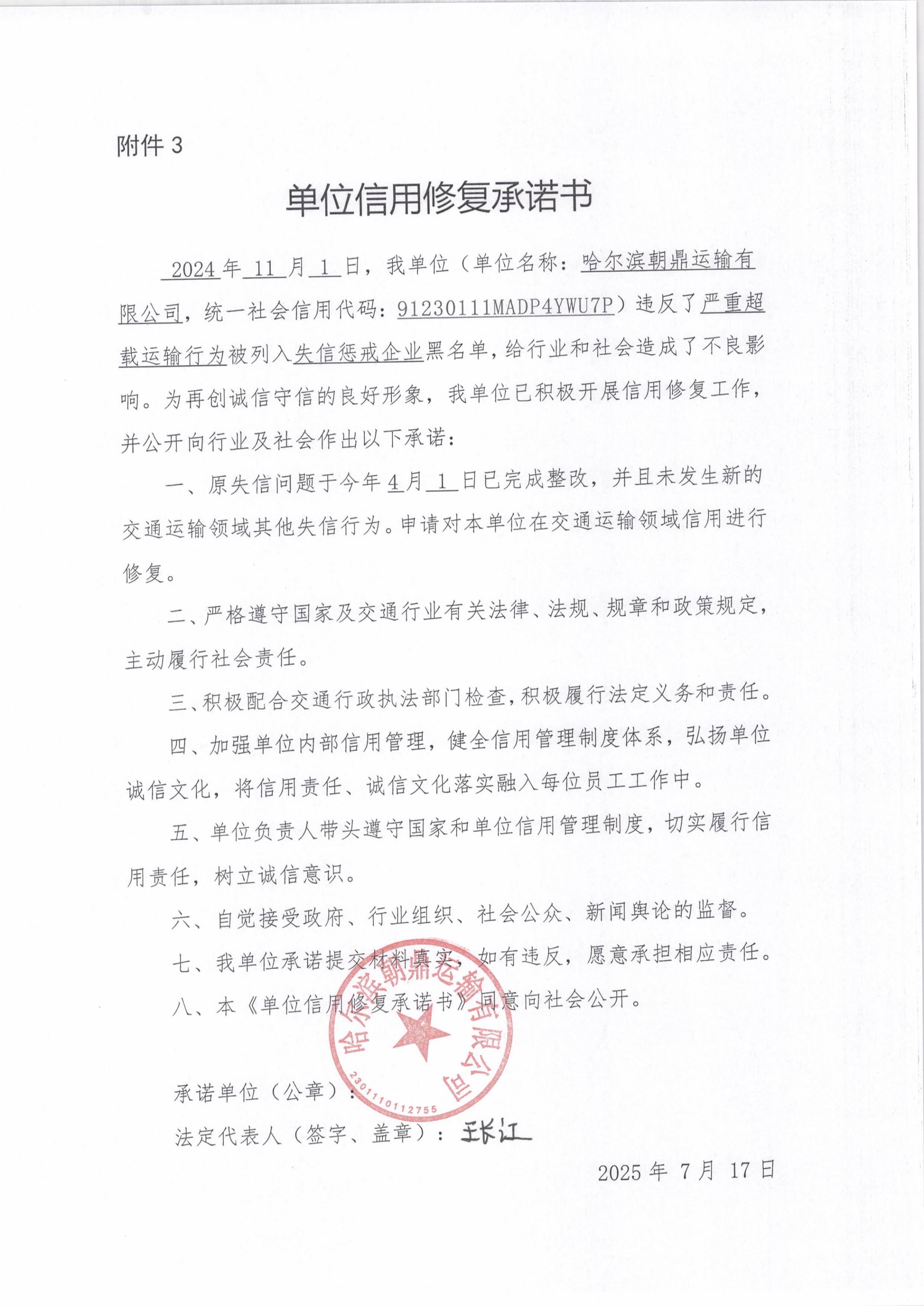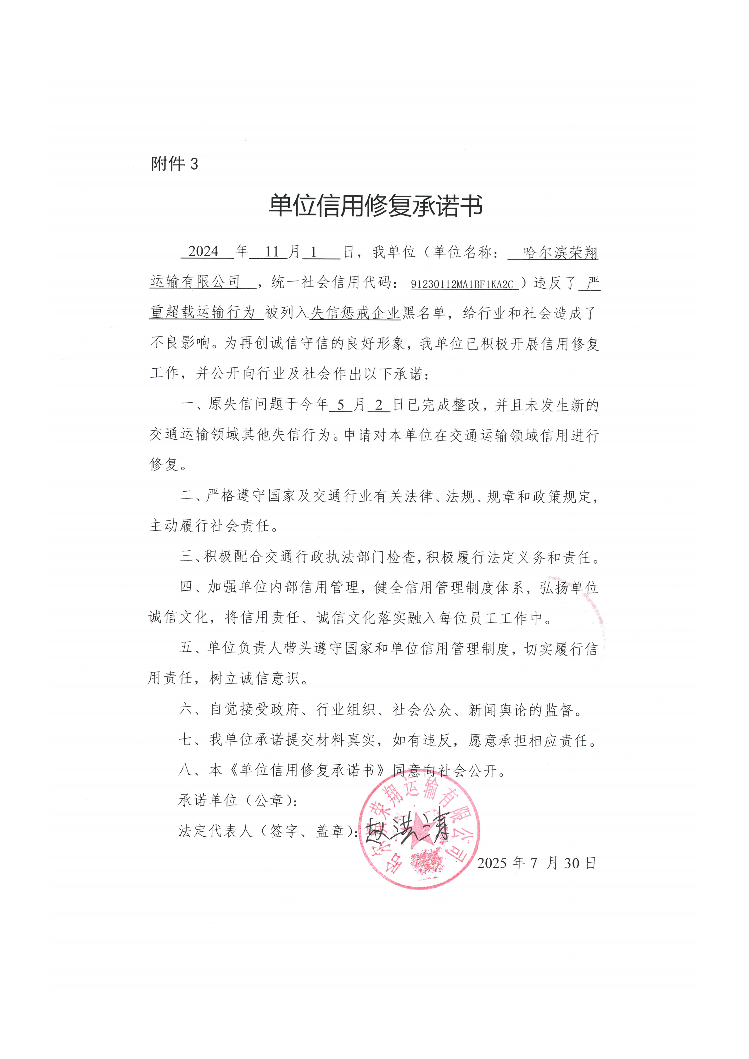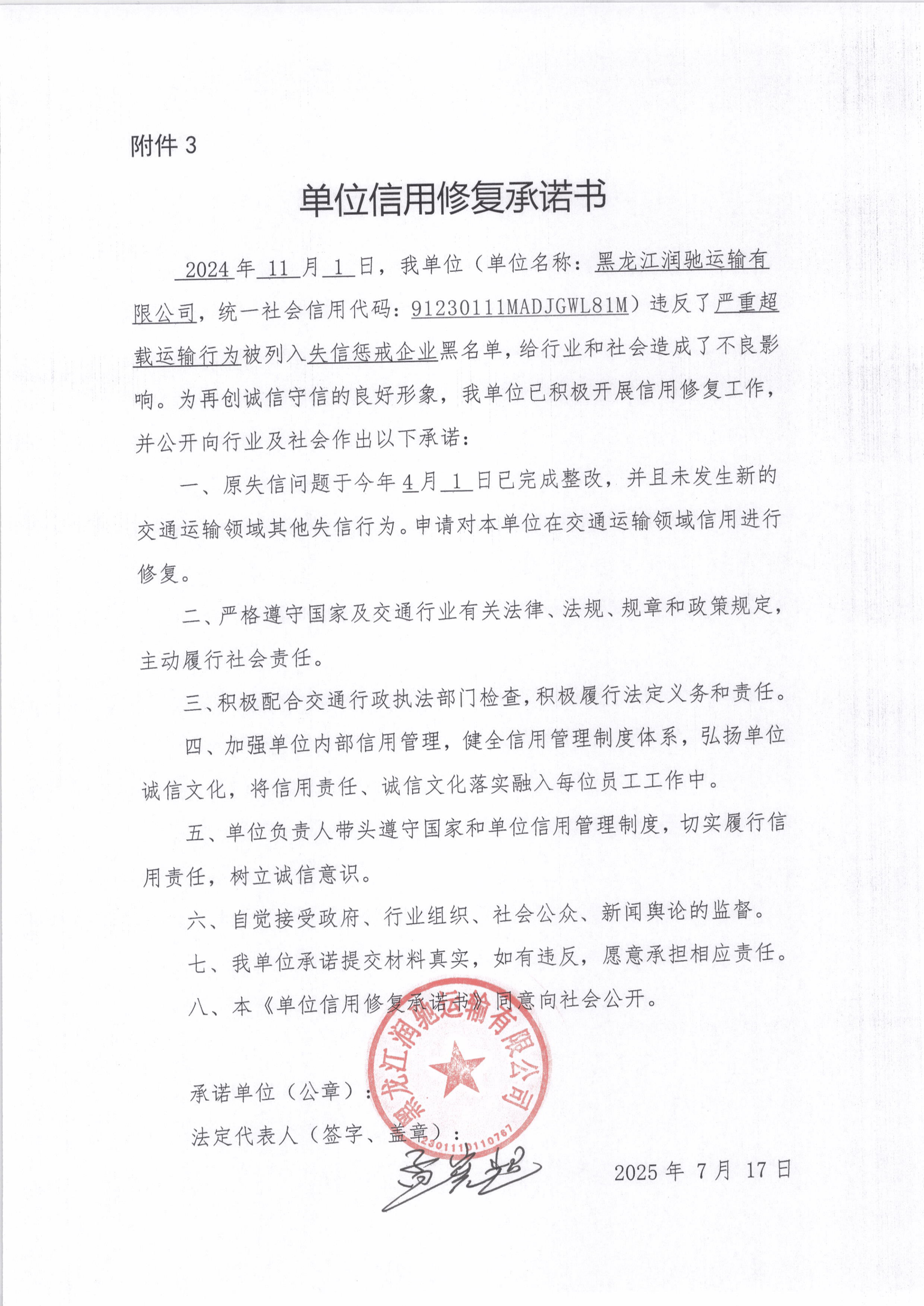 信用修复承诺书