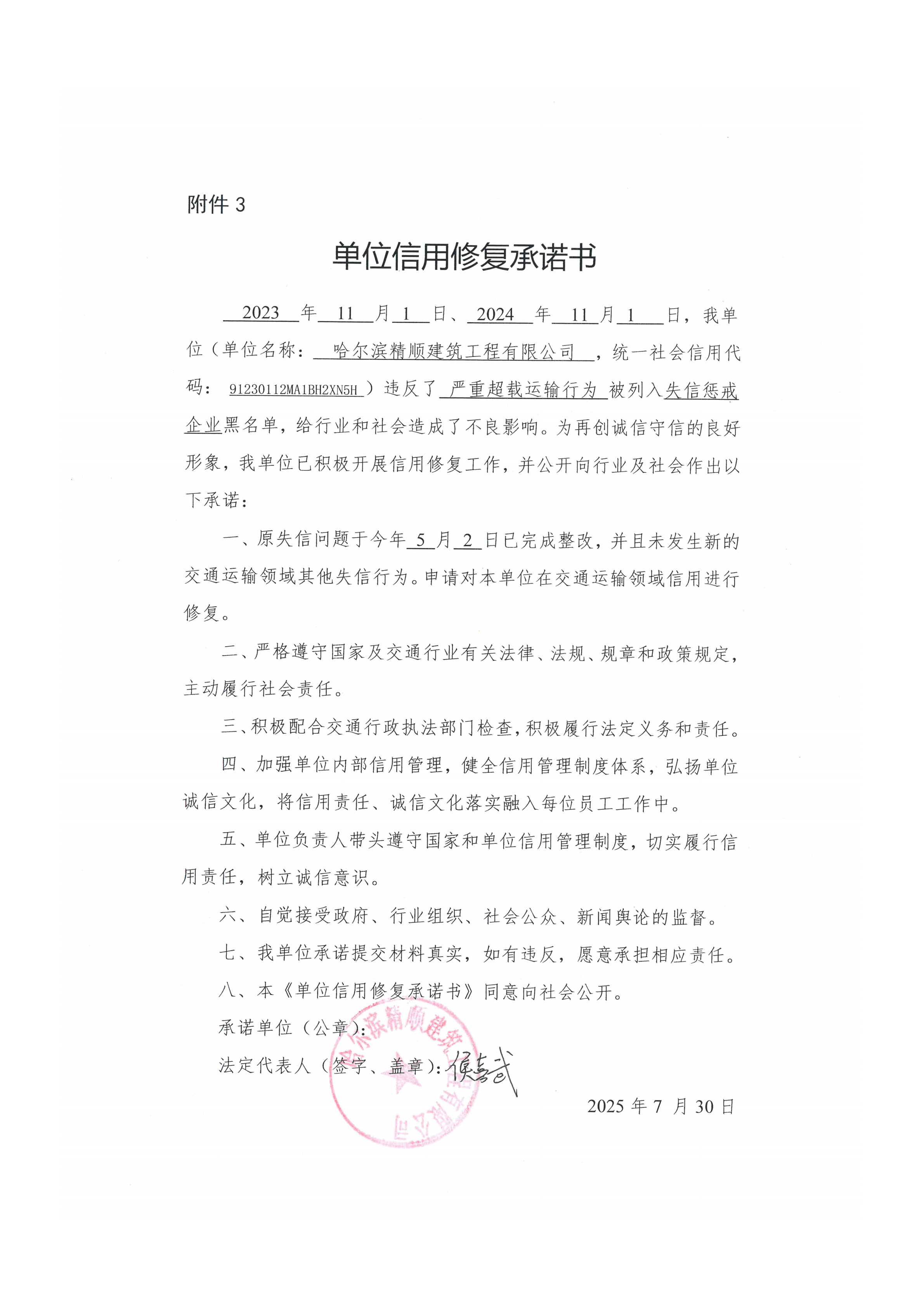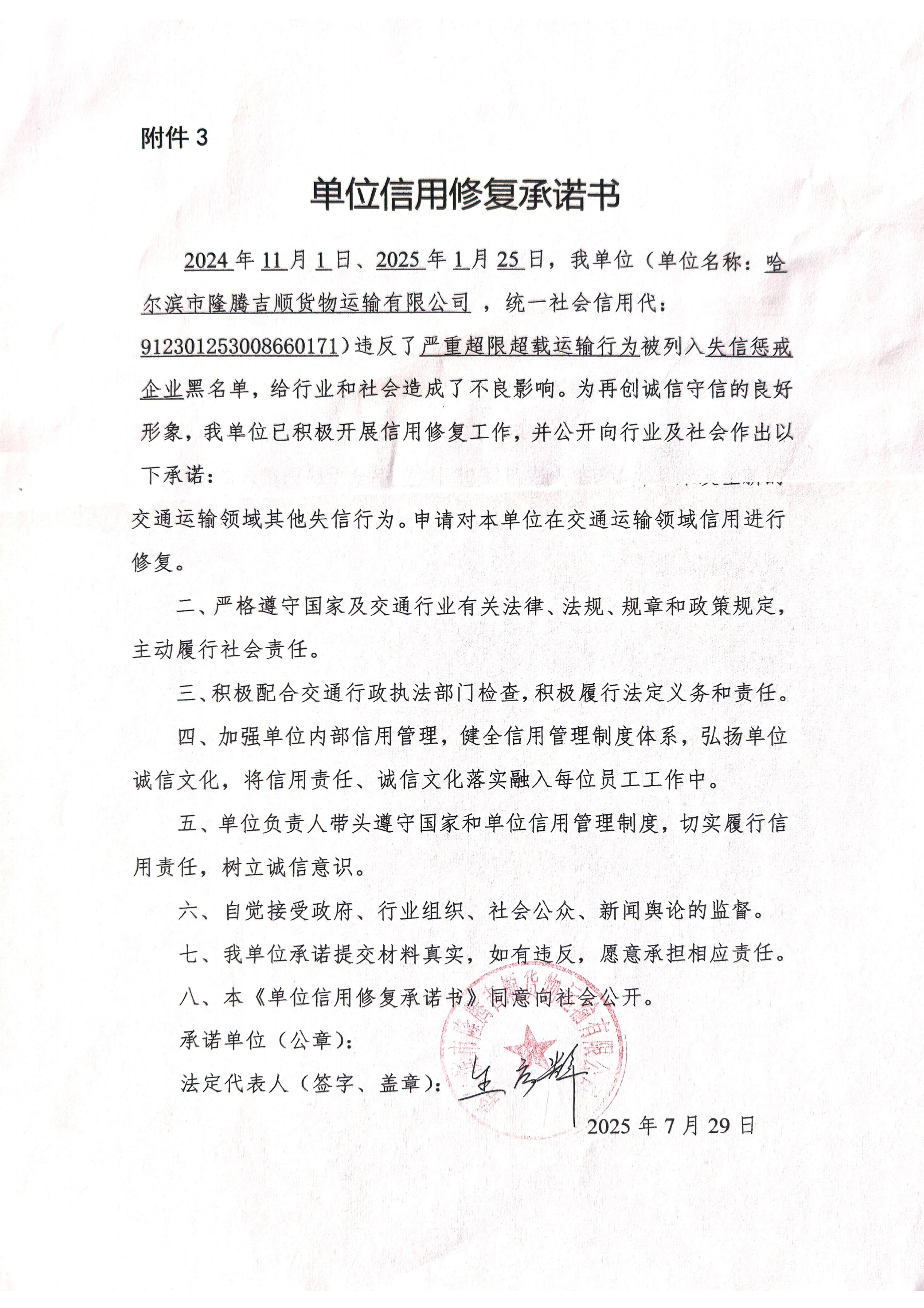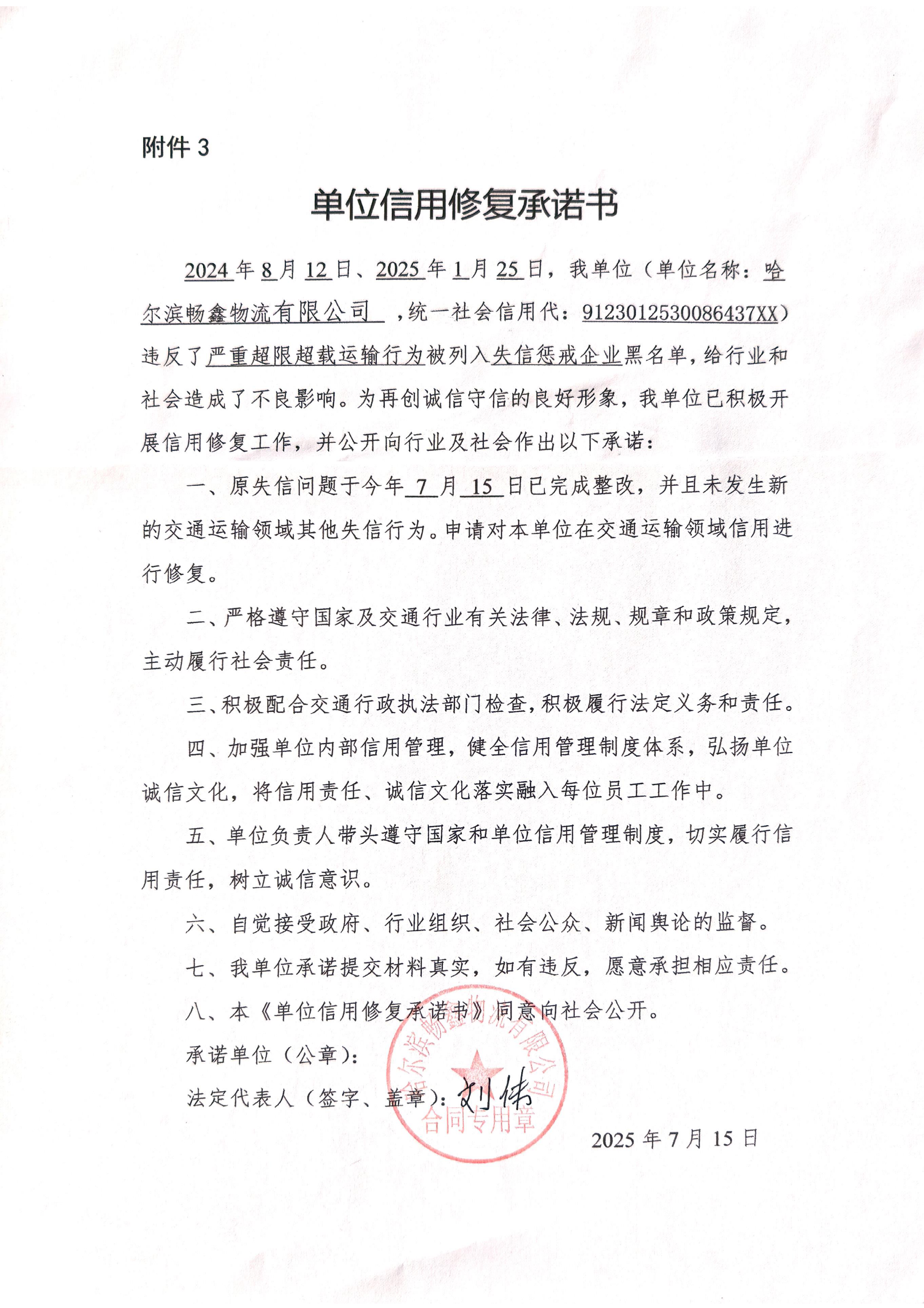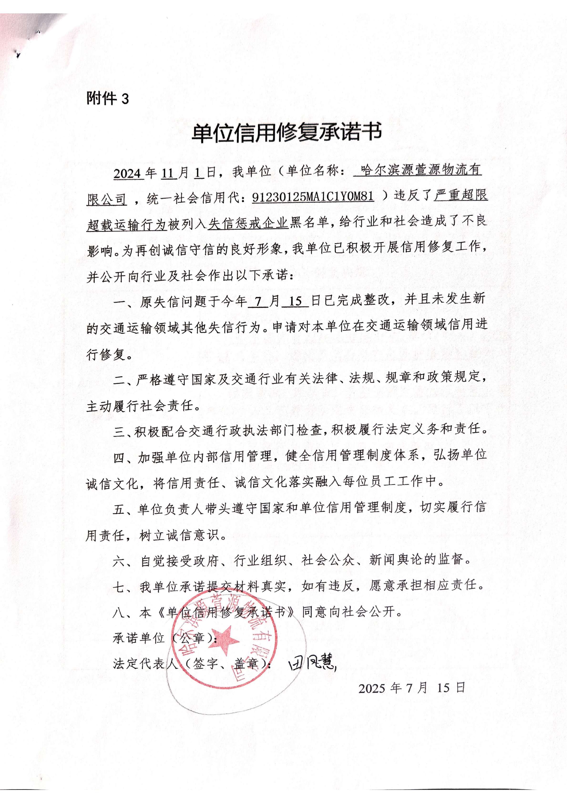 信用修复承诺书