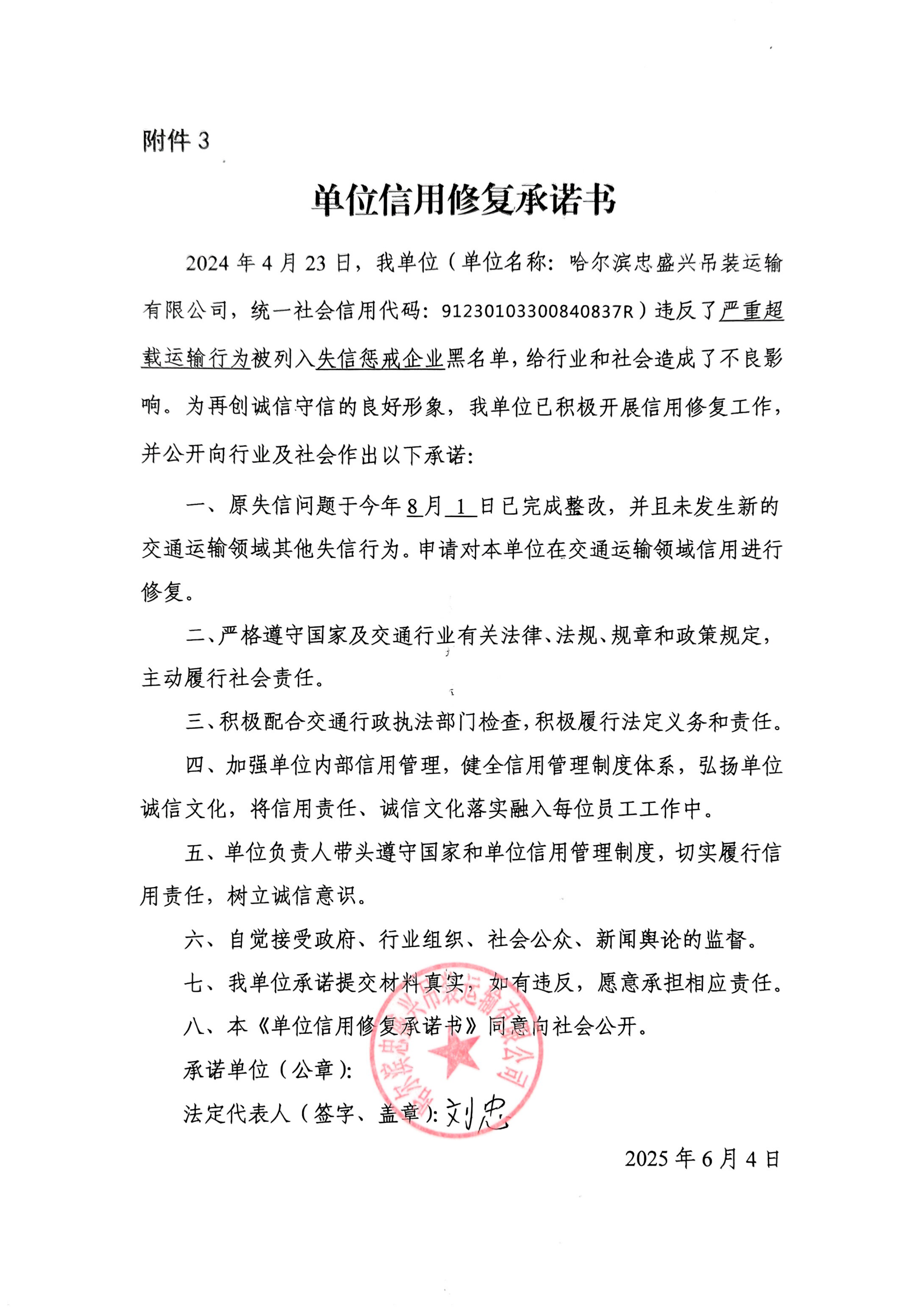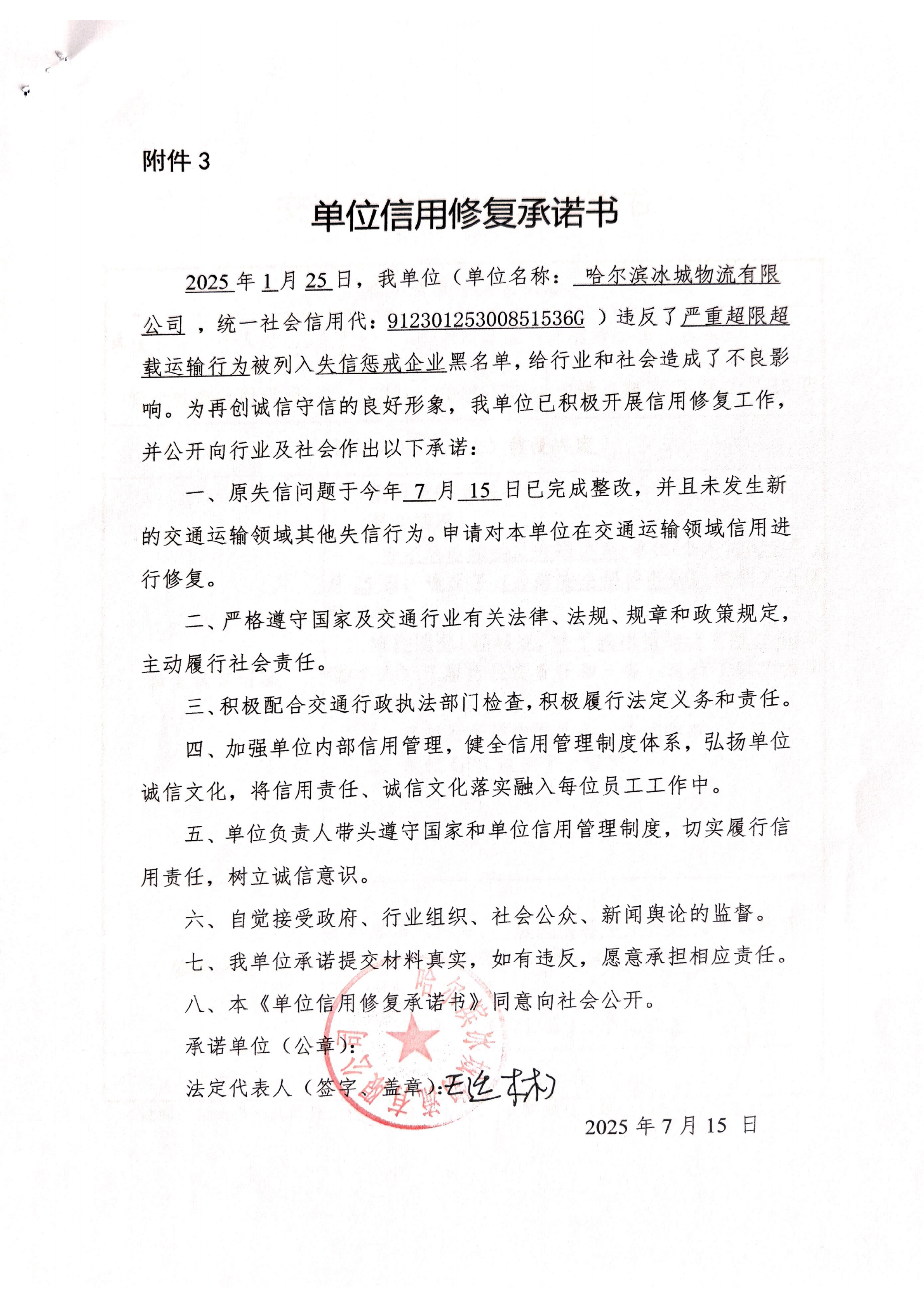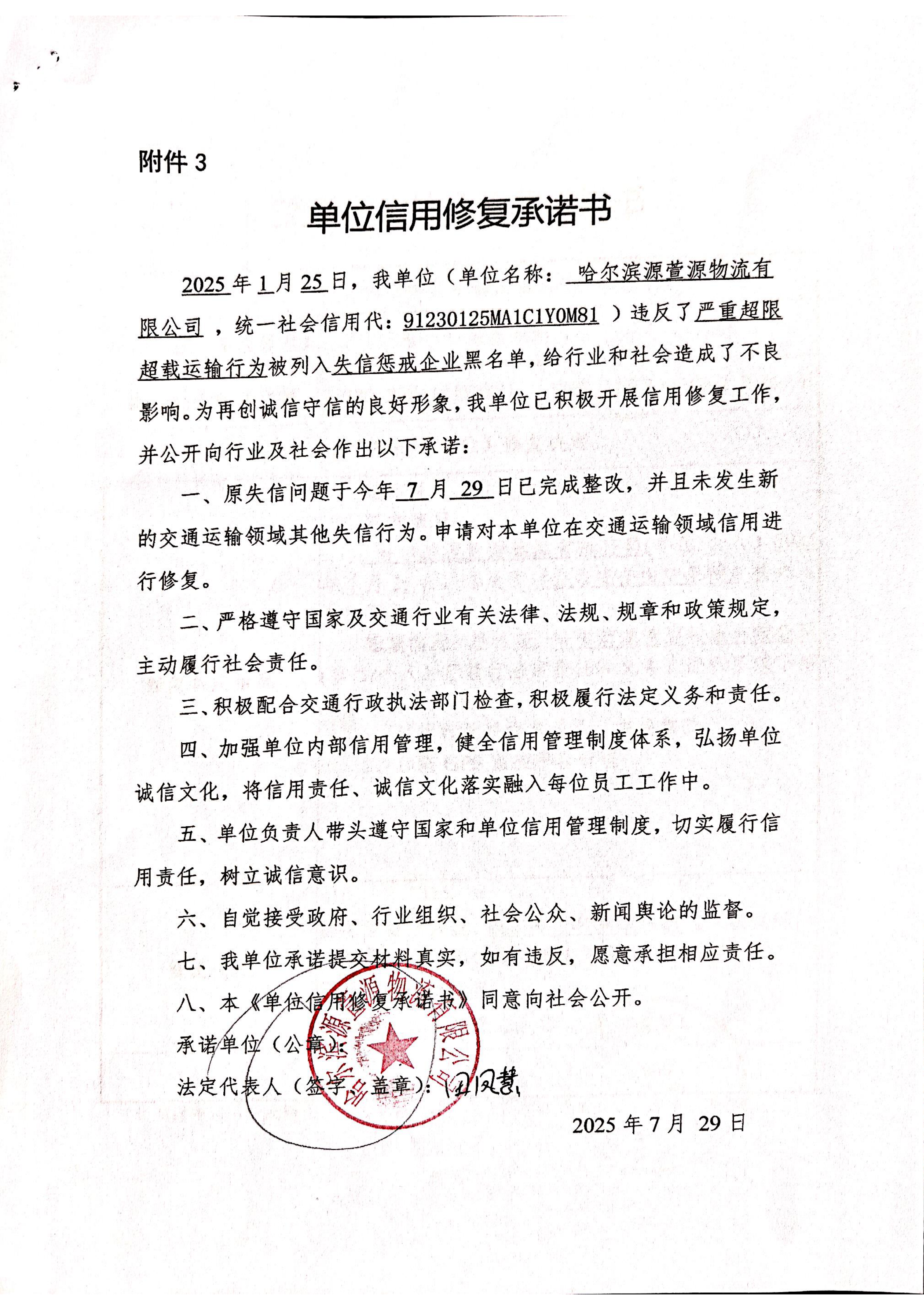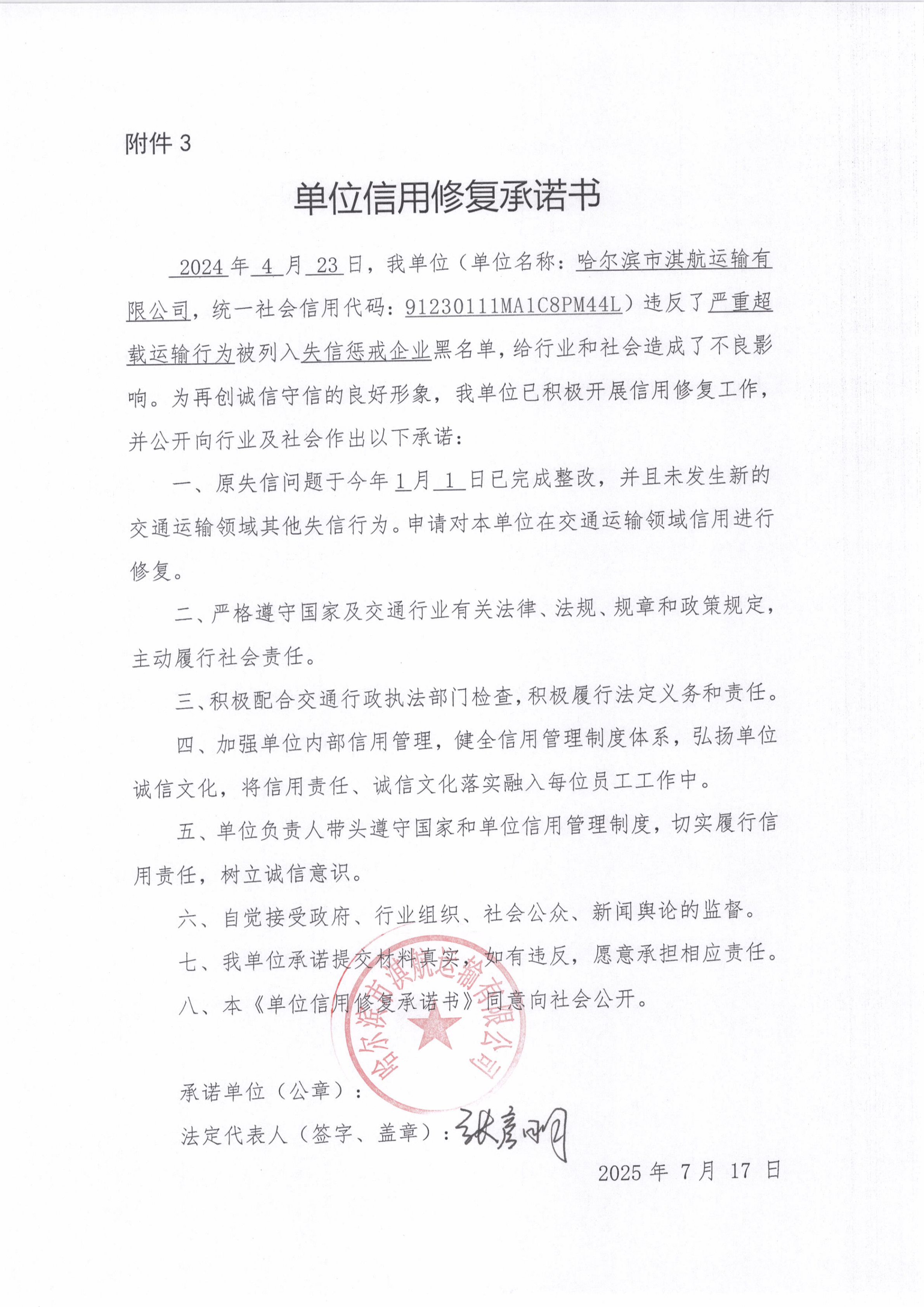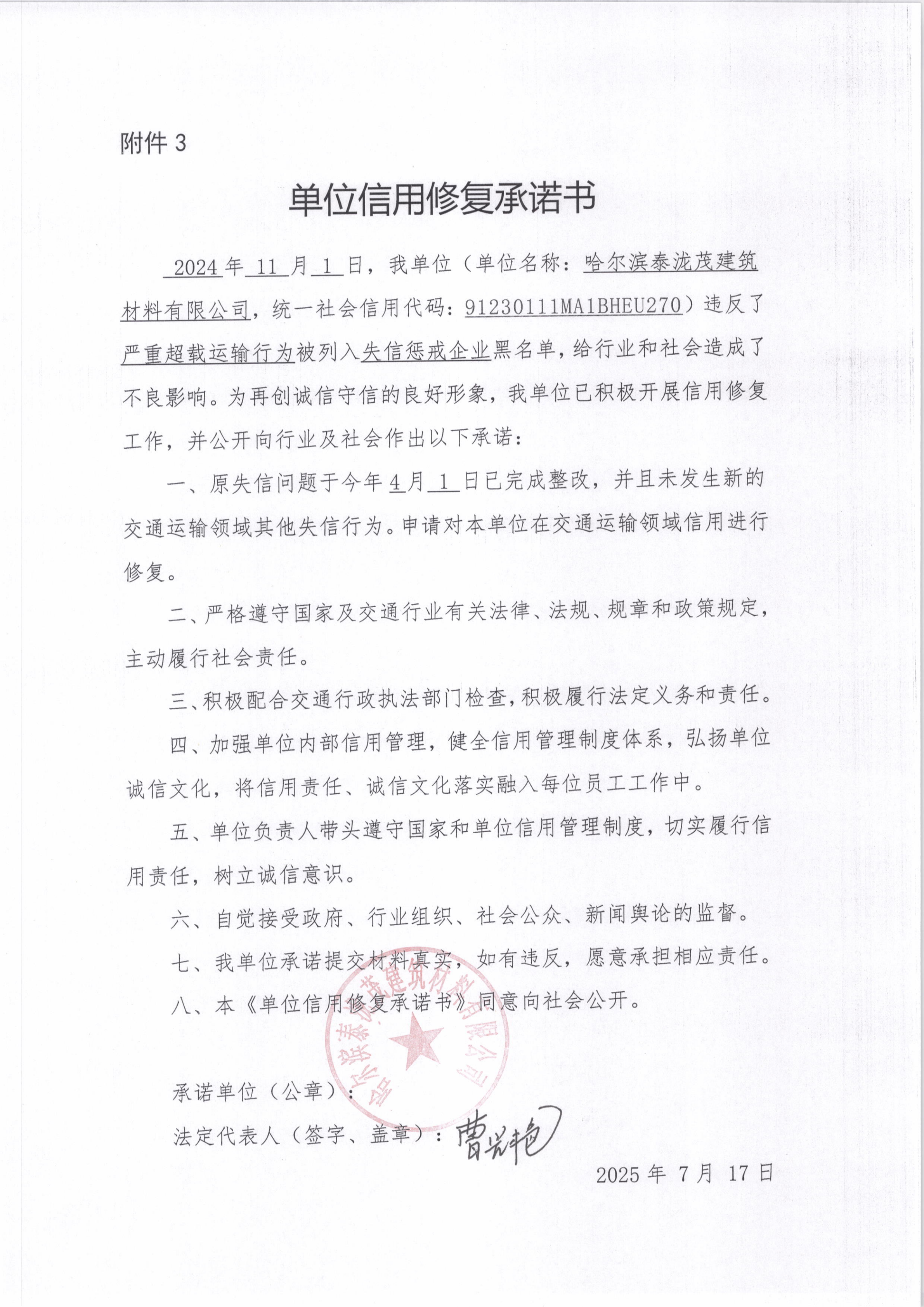 信用修复承诺书