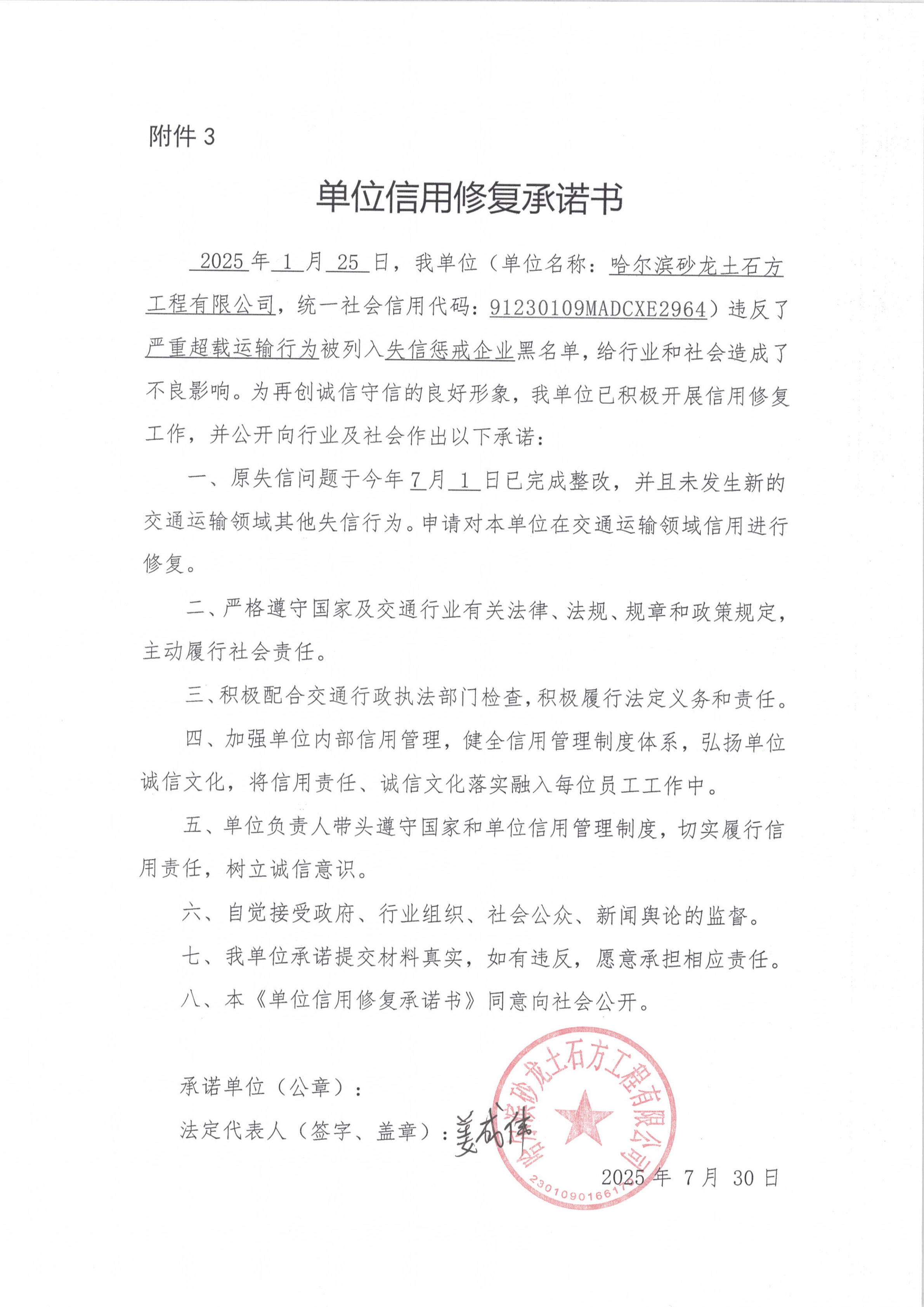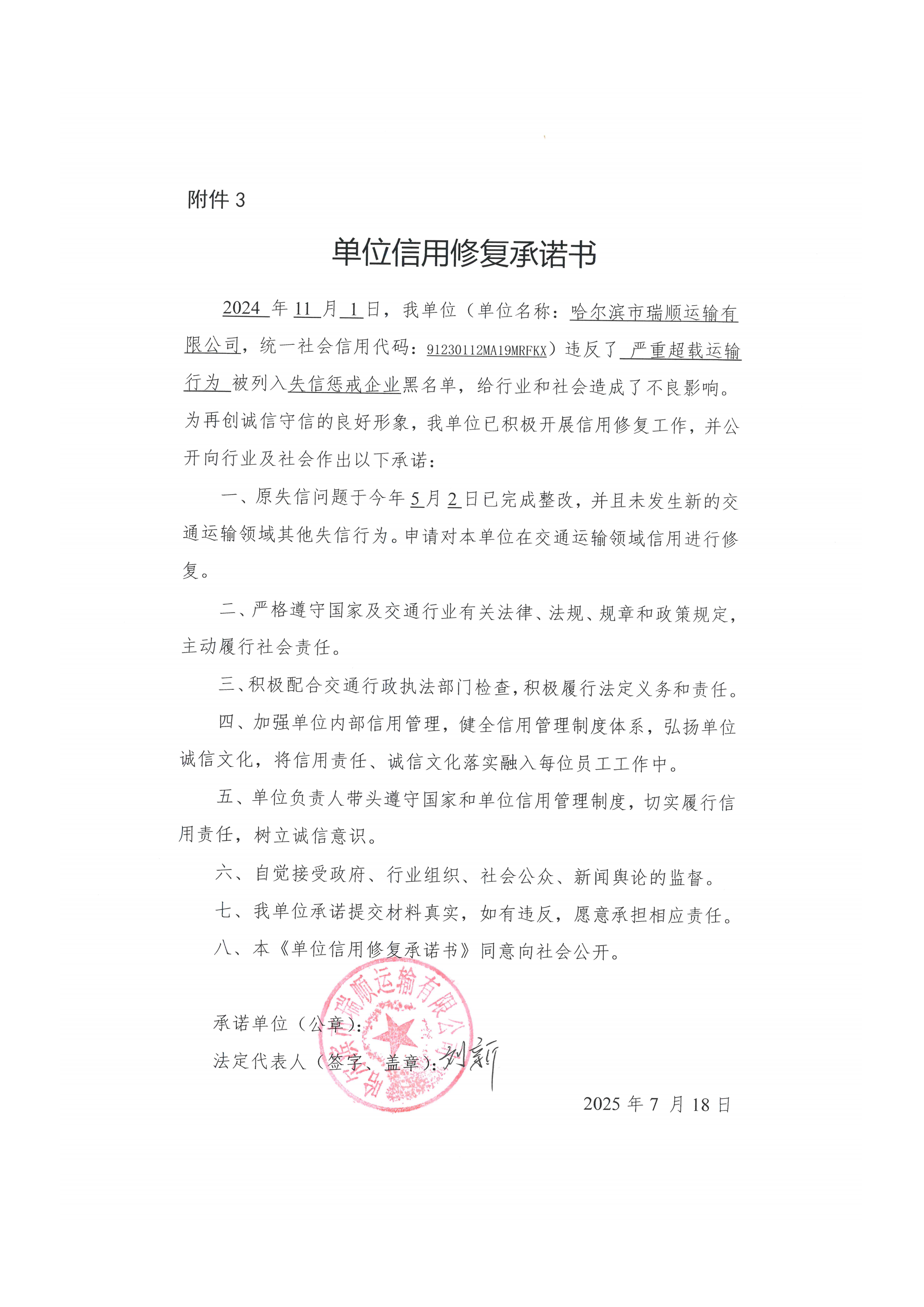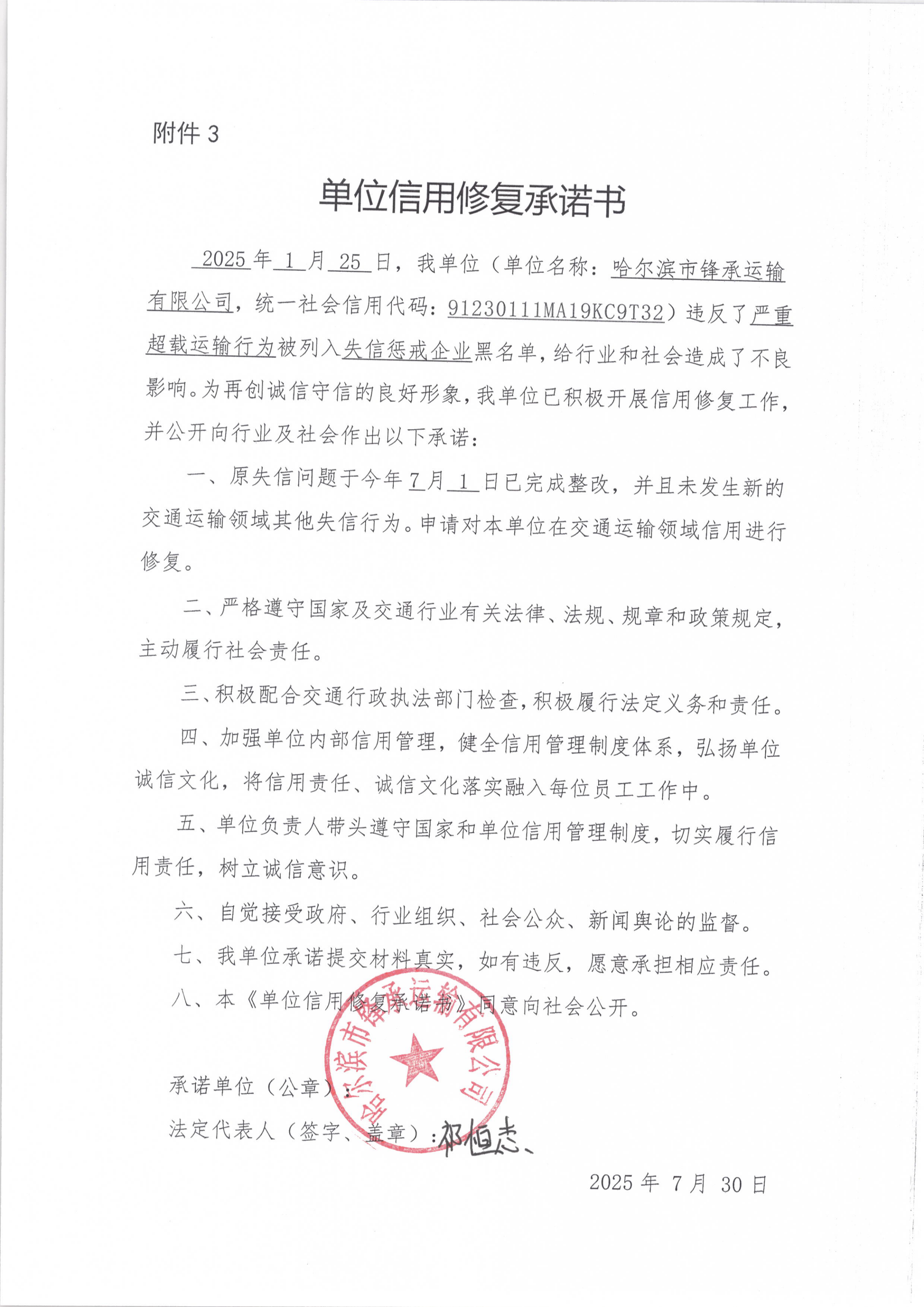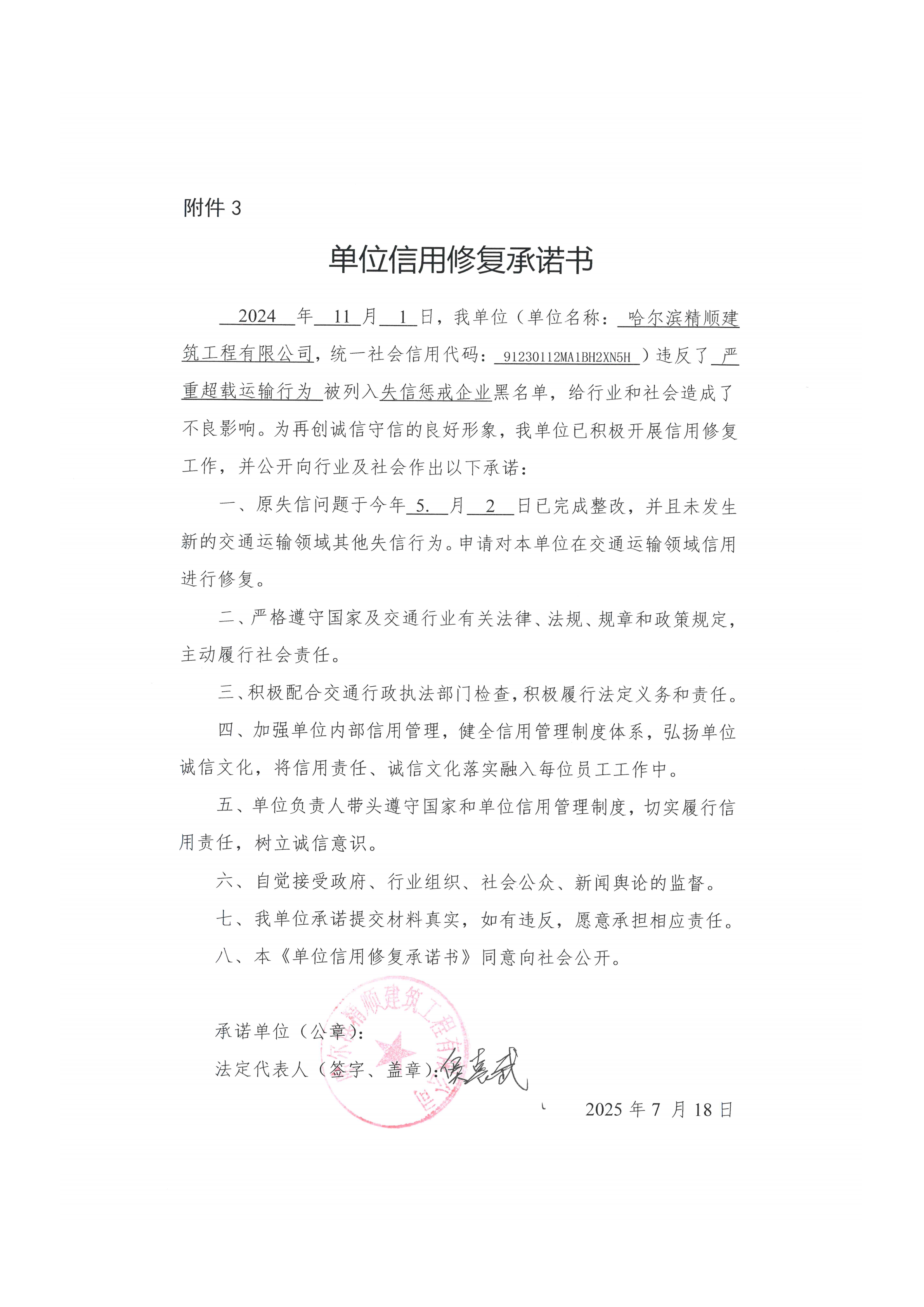 信用修复承诺书