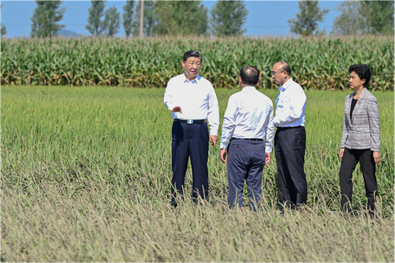 9月6日至8日,中共中央总书记、国家主席、中央军委主席习近平在黑龙江考察。这是7日上午,习近平在遭受洪涝灾害的哈尔滨尚志市老街基乡龙王庙村,察看水稻受灾情况。新华社记者 殷博古 摄