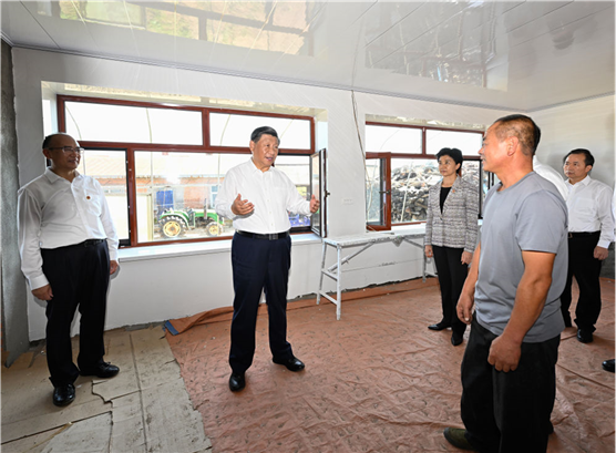 9月6日至8日,中共中央总书记、国家主席、中央军委主席习近平在黑龙江考察。这是7日上午,在遭受洪涝灾害的哈尔滨尚志市老街基乡龙王庙村,习近平走进村民杨春贵家中,察看受损房屋修缮情况。新华社记者 殷博古 摄